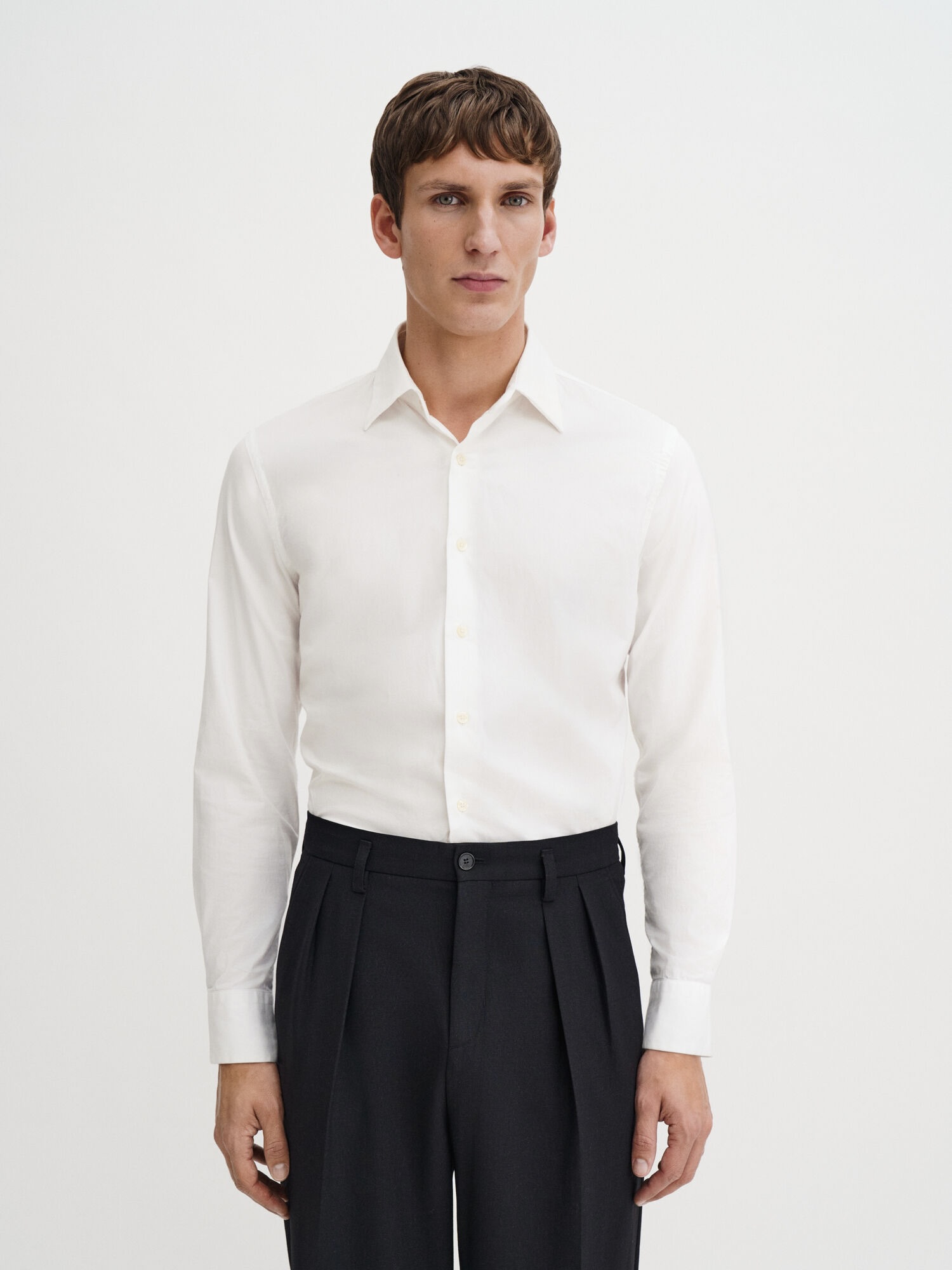 Slim-fit shirt in lightweight organic cotton poplin with stretch. The stiff collar and cuffs, as well as the classic shirt details, make it ideal for business occasions and going out. This piece is part of our Core Collection: timeless styles designed with the essential elements of a basic wardrobe in mind.