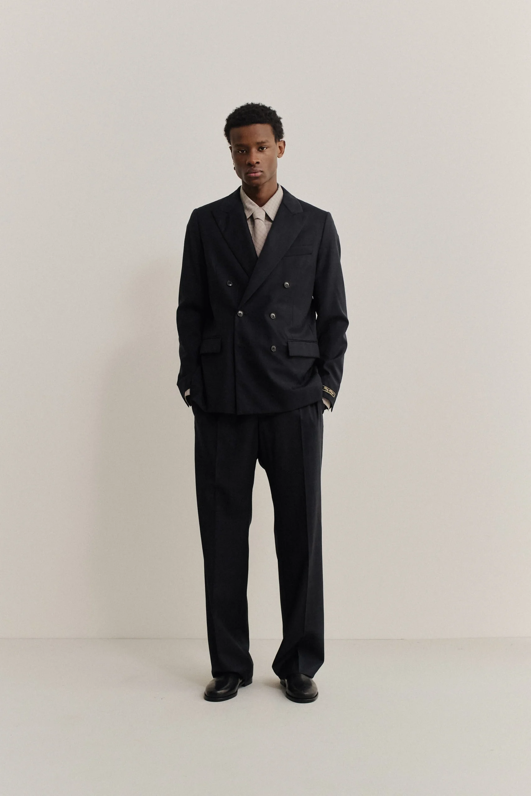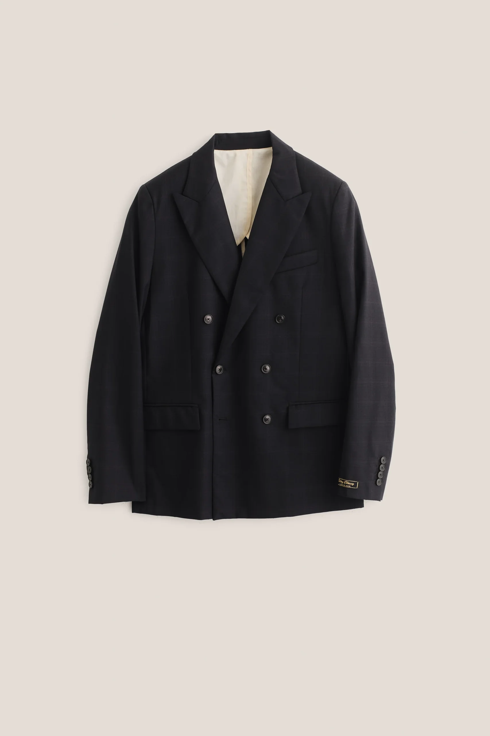 The Double-Breasted Peak Blazer offers a formal cut and an extra-wide peaked lapel and classic frankfurter pockets. It’s versatile enough to pair with tapered, wide-leg, or our relaxed tailored trousers. Completed with our signature “stay classy“ label at the sleeve.