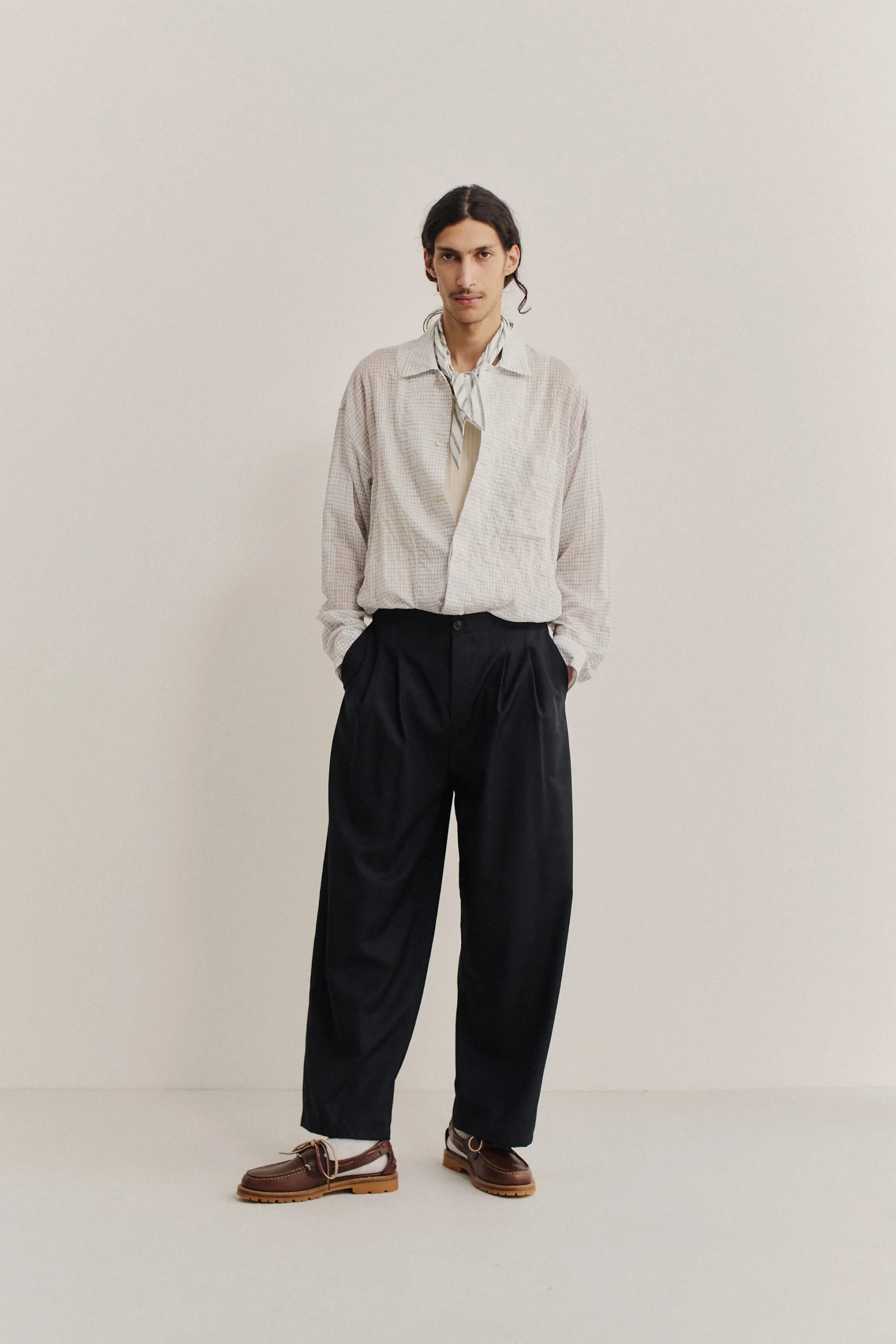 The Piero Pants have a relaxed fit, wide leg, double side pleats, slanted side pockets, a back welt pocket with button closure, and adjustable side straps for a custom fit.