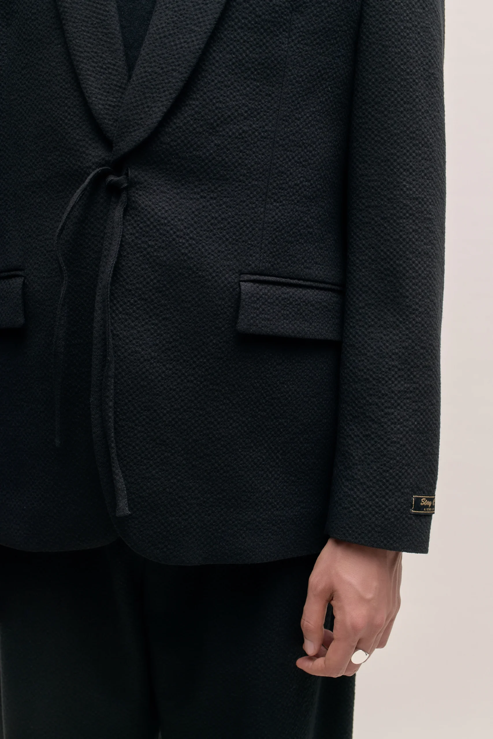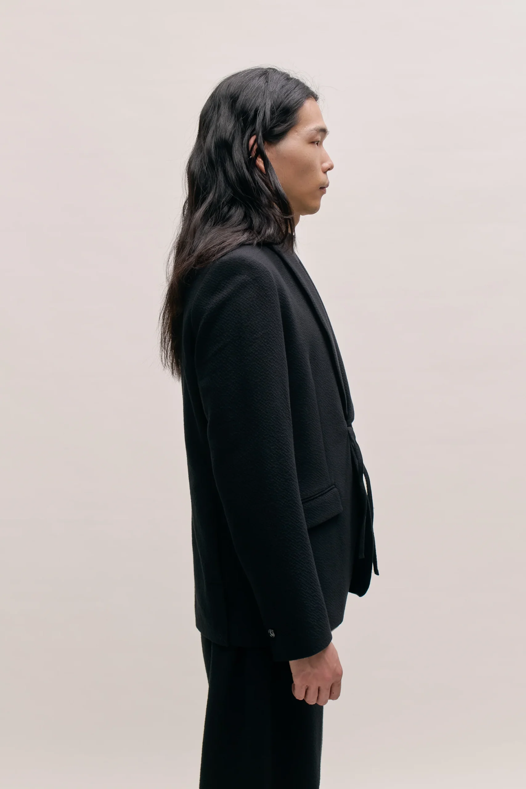 The Shinji Blazer has a trim silhouette. It features a refined shawl collar, two flap pockets, a welt chest pocket and a kimono-inspired cord closure. Completed with our signature ”stay classy” label at the sleeve.