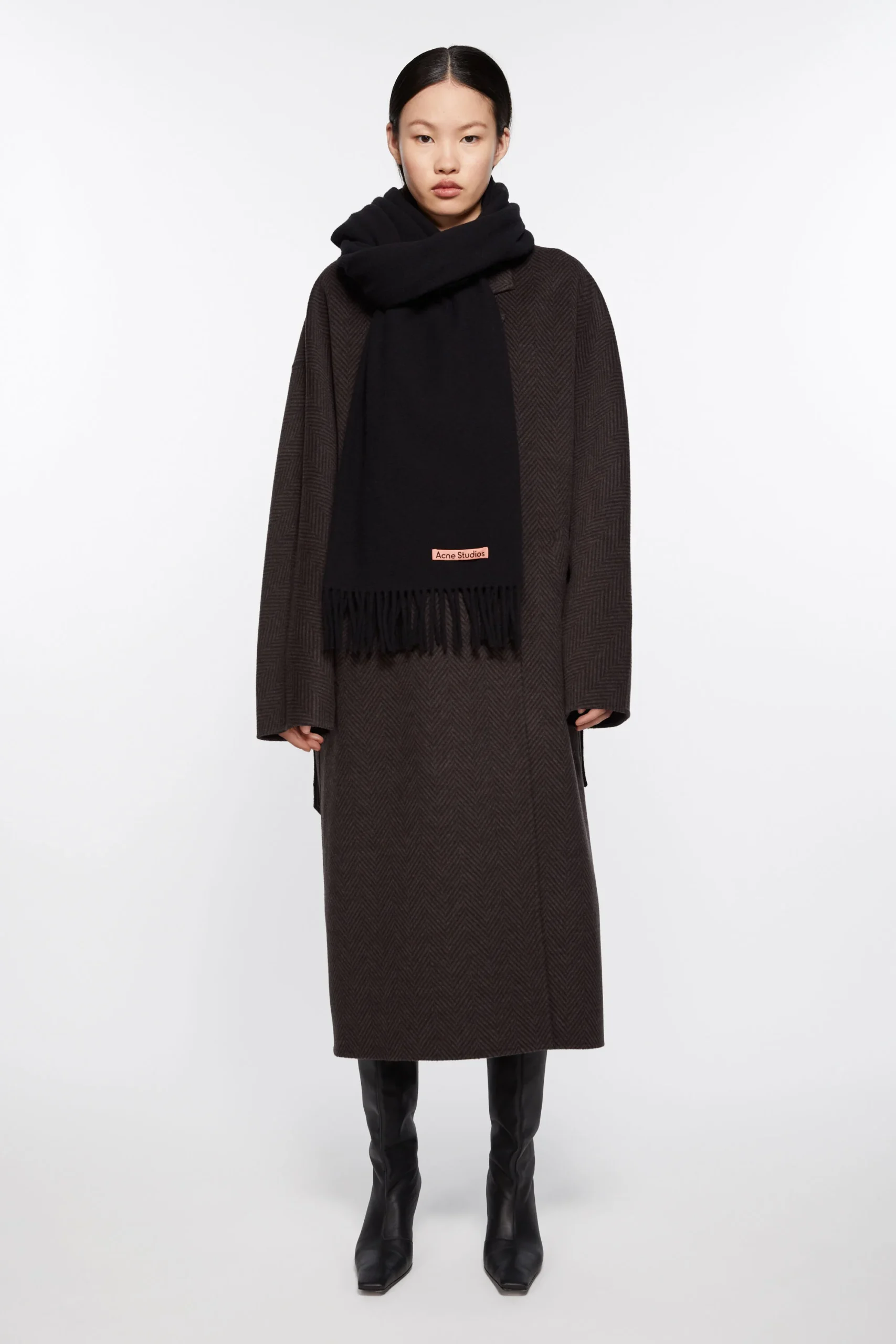 • Fringed scarf is crafted from midweight wool with a soft hand-feel, detailed with a pink Acne Studios label