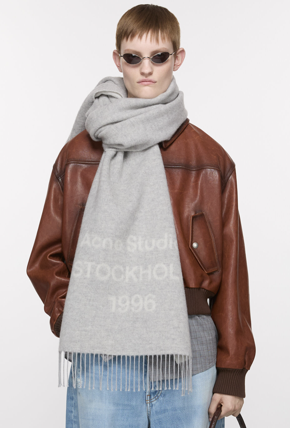 Fringed scarf crafted from soft wool, double-faced jacquard details with an Acne Studios 1996 tonal logo.