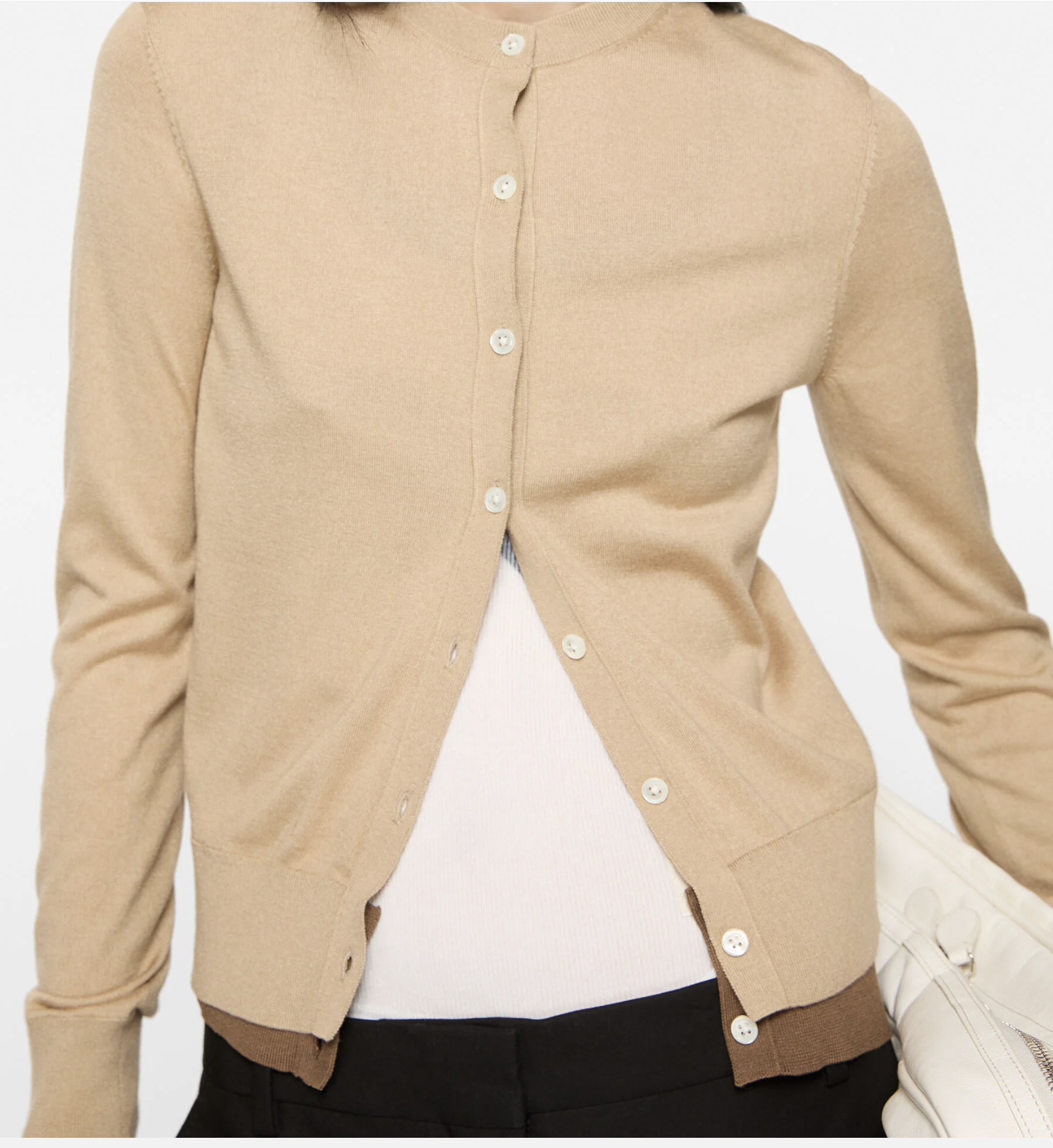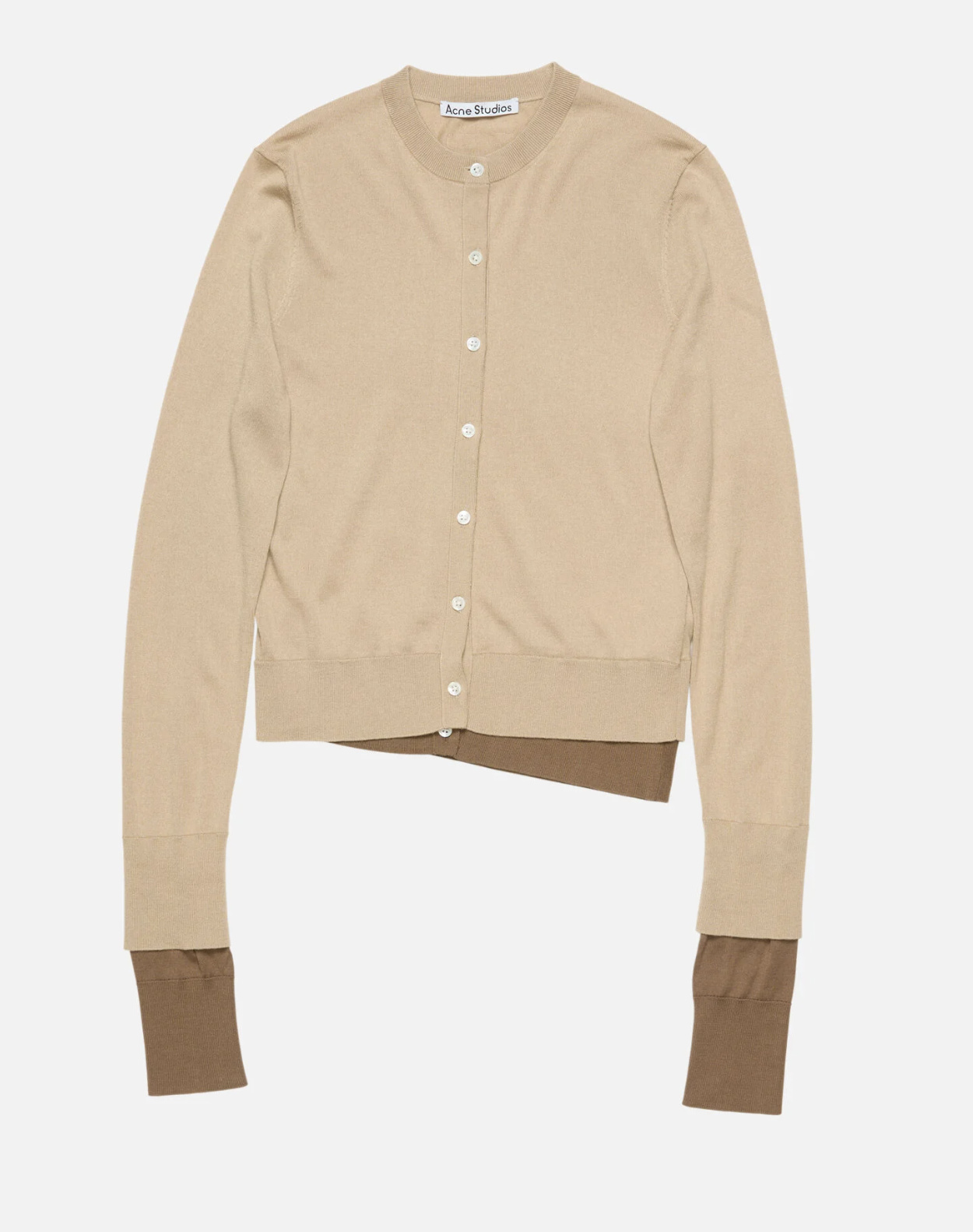 Layered cardigan crafted from lightweight silk knit. Features a double-layered construction and a button-up closure. Finished with a logo patch at the back neckline. Cut for a regular fit and a below-the-waist silhouette.