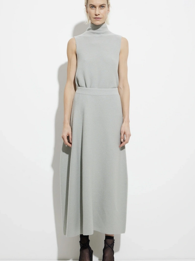 Seamlessly knitted from extra fine merino wool, this skirt offers a clean, columnar silhouette with subtle volume through the hem. The asymmetrical balloon shape adds quiet movement and dimension. Designed to sit on the waist with a ribbed waistband.