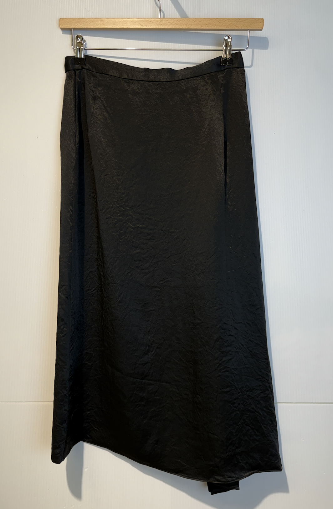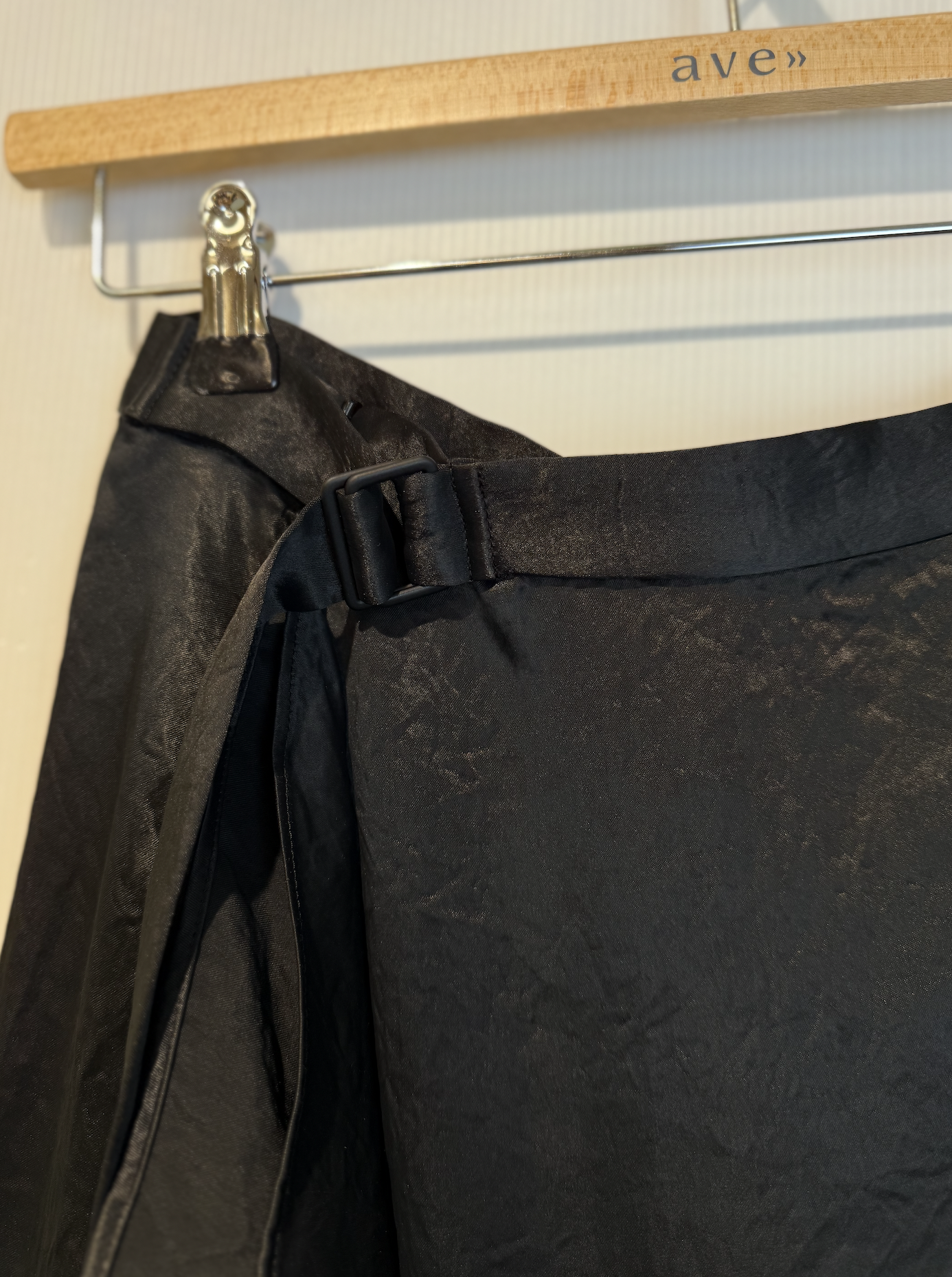 A woven skirt with an uneven hem and belt detail. The asymmetrical cut creates visual interest while the belt closure ensures a secure, adjustable fit, a versatile piece for refined styling.