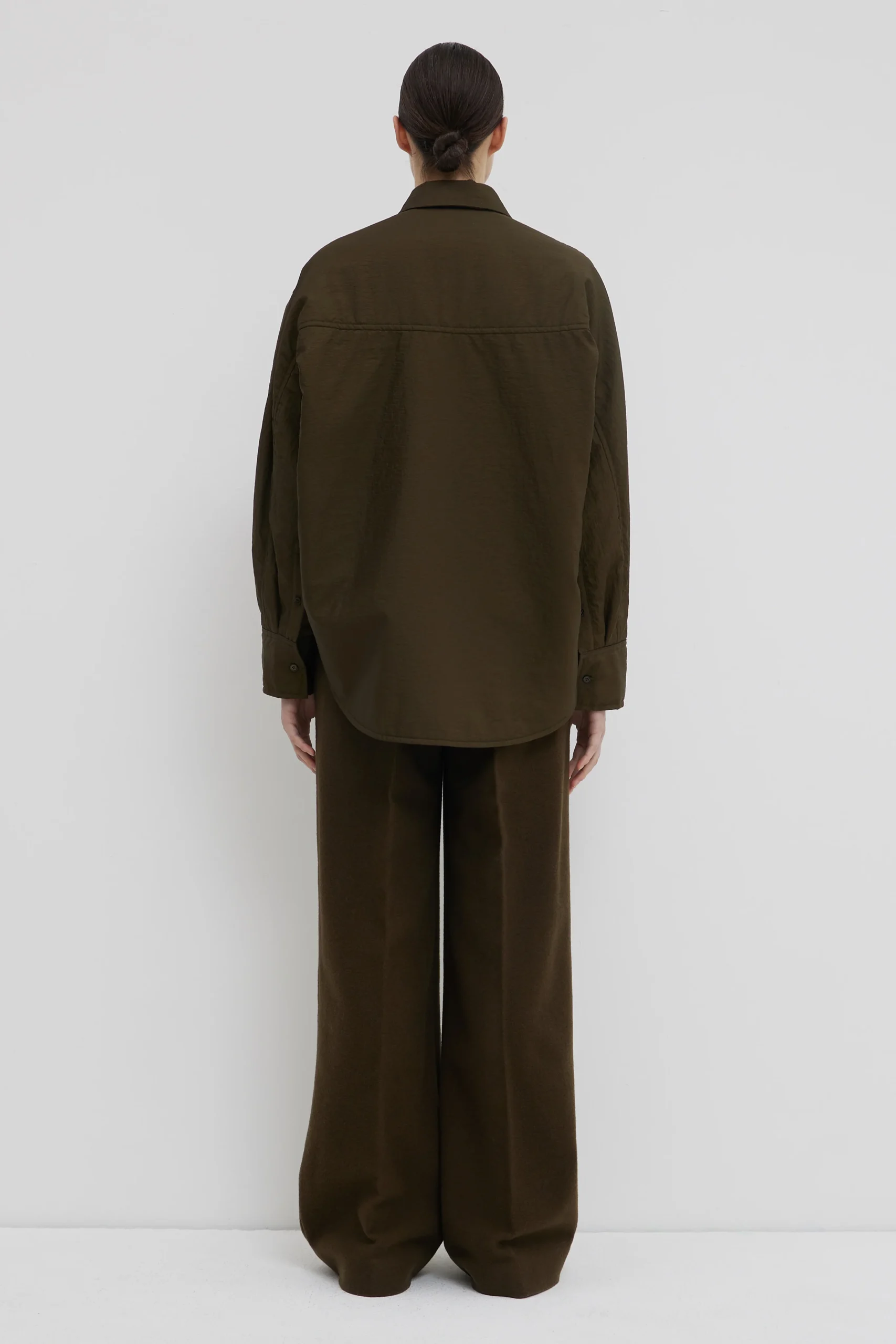 Cut from lightly padded and textured nylon, this overshirt is shaped with a boxy silhouette and dropped shoulders. Oversized flap pockets add a utilitarian edge, while the concealed placket and curved hem keep the lines refined. Can be worn closed as a shirt or layered open as a lightweight jacket.