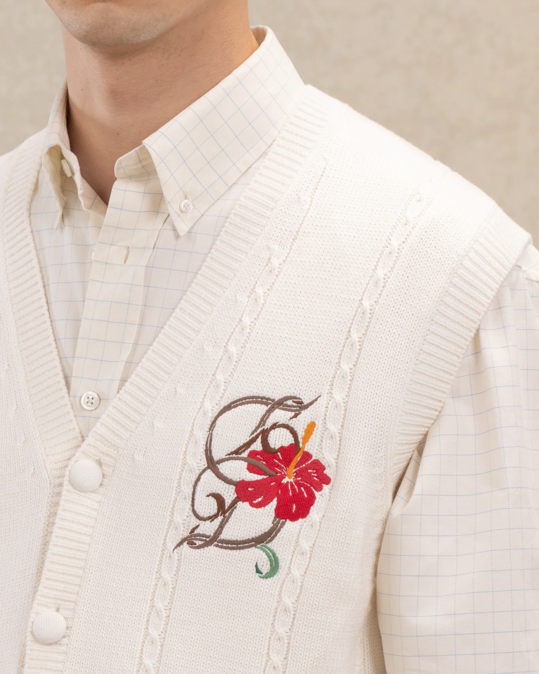 Made from wool and cotton, this off-white sleeveless vest features a vertical cable knit, a mirrored ‚D‘ Hibiscus embroidery on the front, and a single-breasted five-button closure.