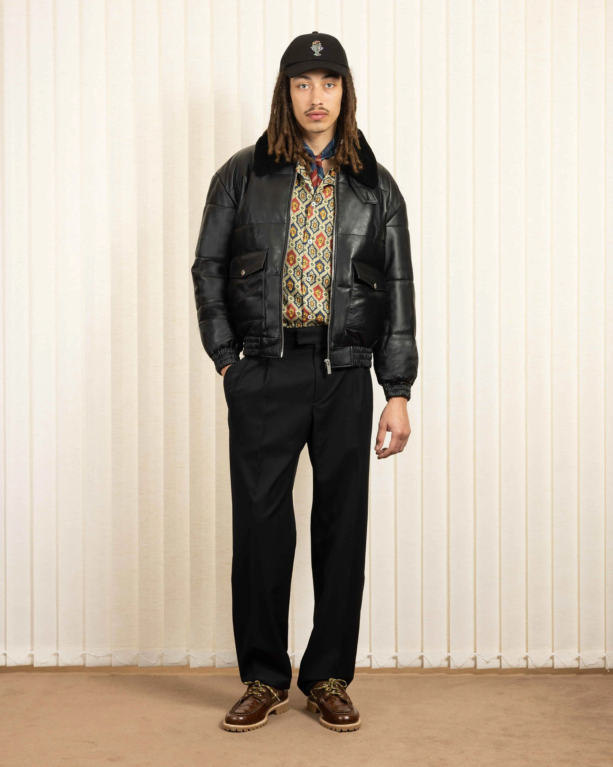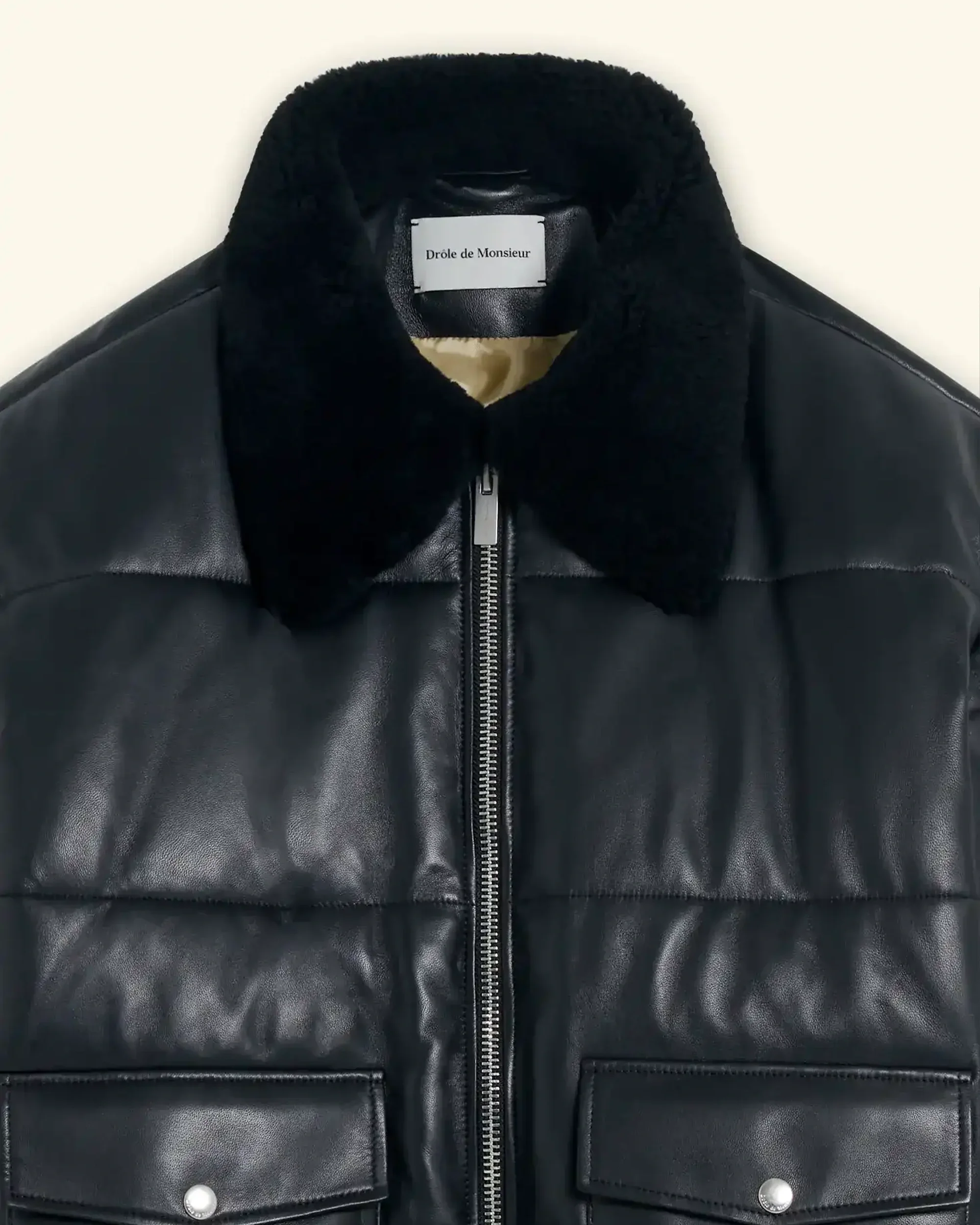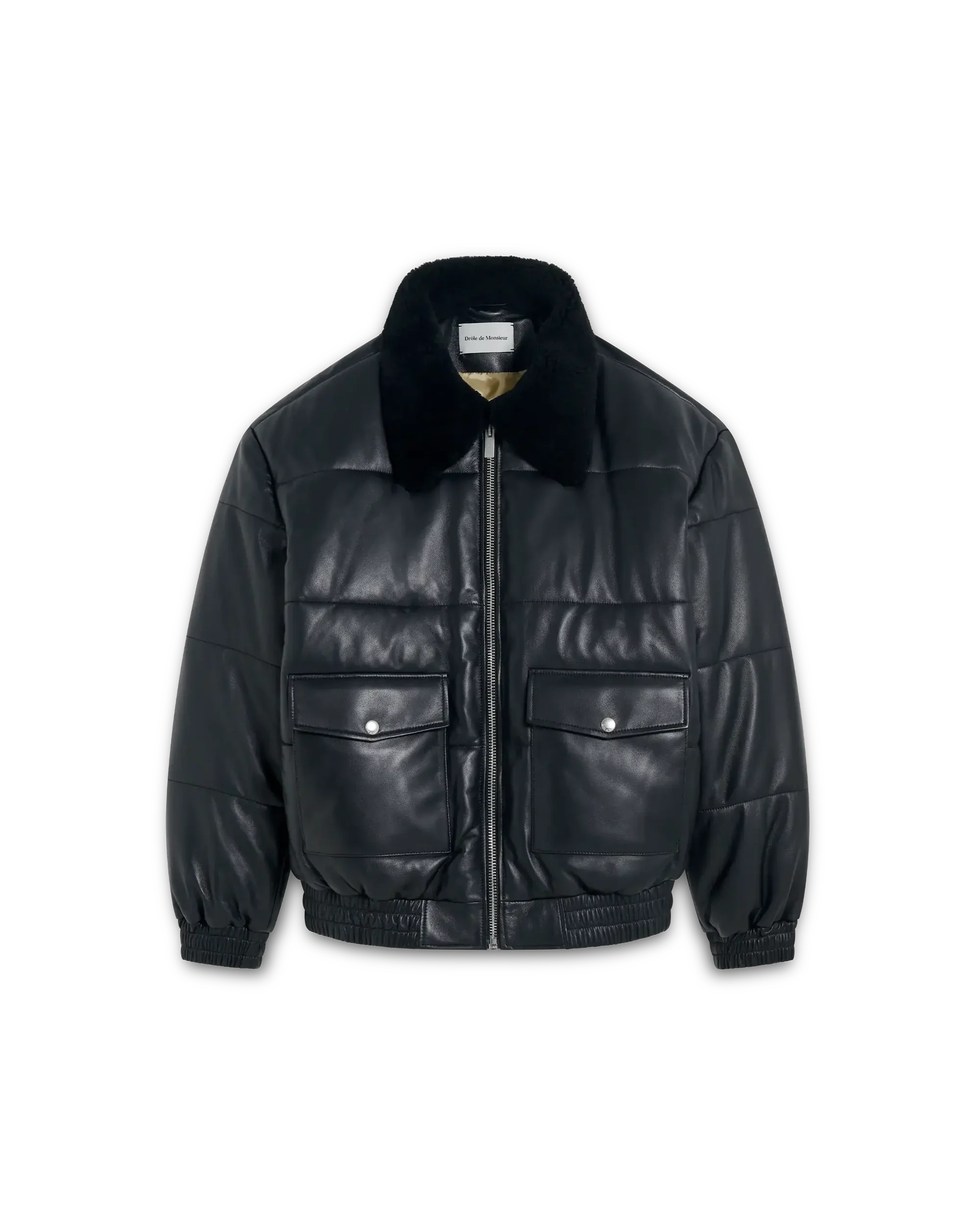 This black quilted lamb leather jacket features a shearling collar, front patch pockets, engraved snap buttons and ribbed hem and cuffs.