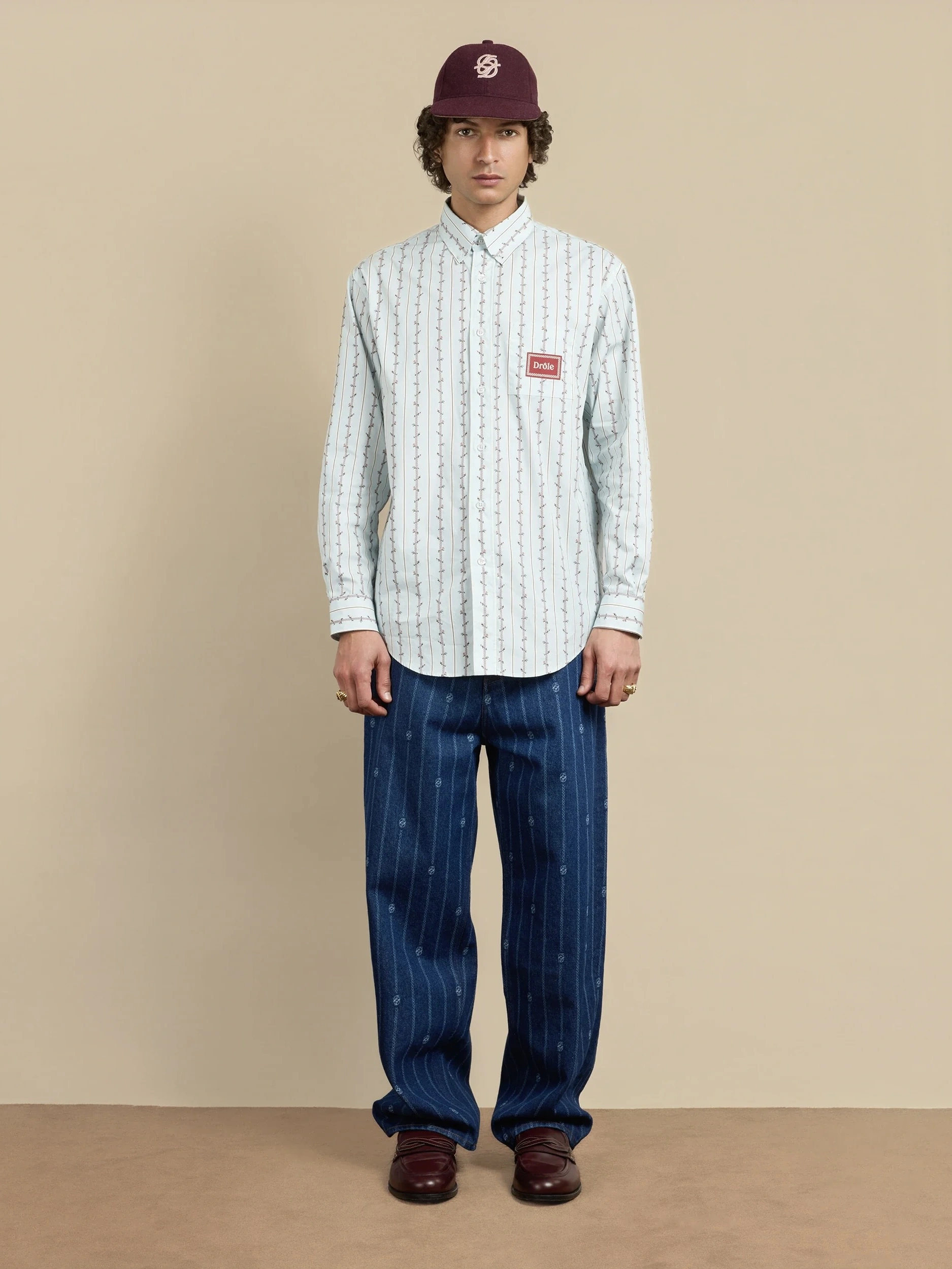 This light blue 100% cotton long-sleeved shirt features a woven ‚Drôle‘ label on the front patch pocket. It has an American placket, a back yoke, buttoned wrists, a shirttail hem and six engraved buttons on the front.