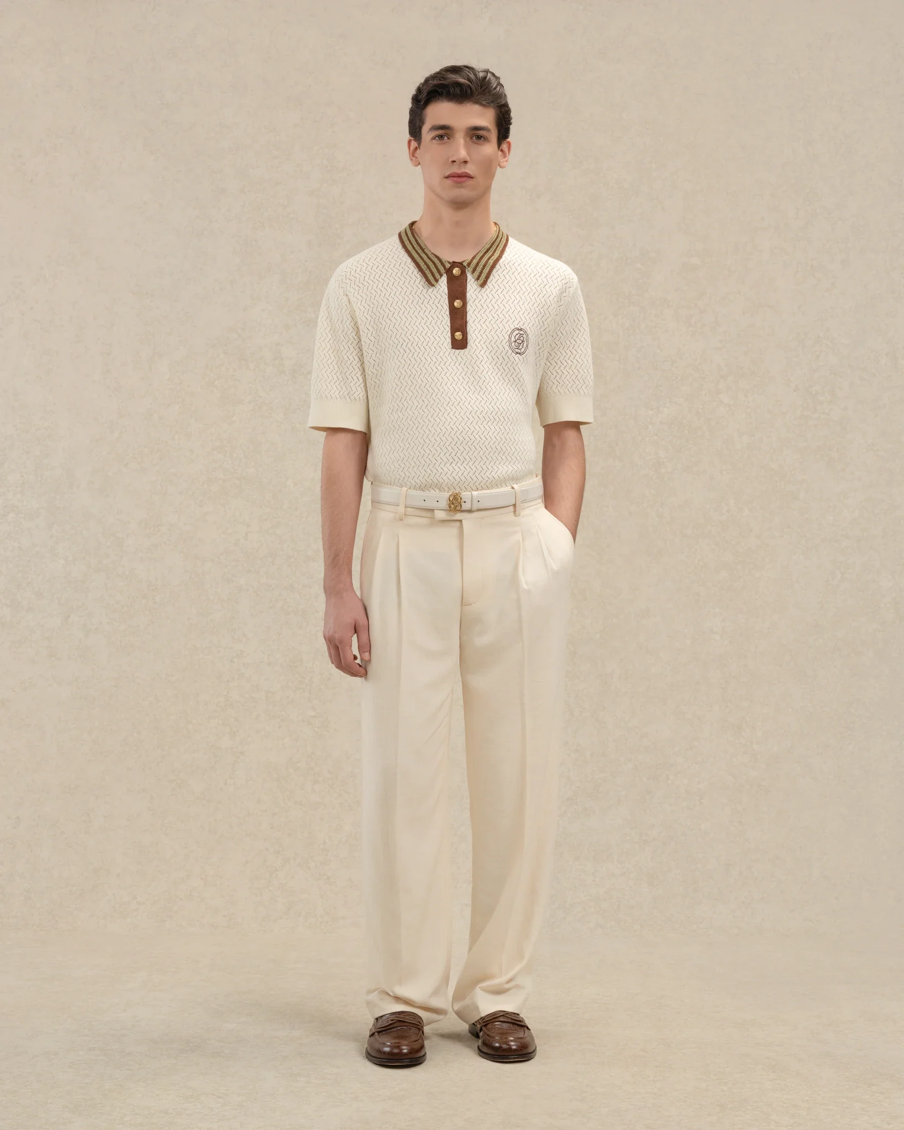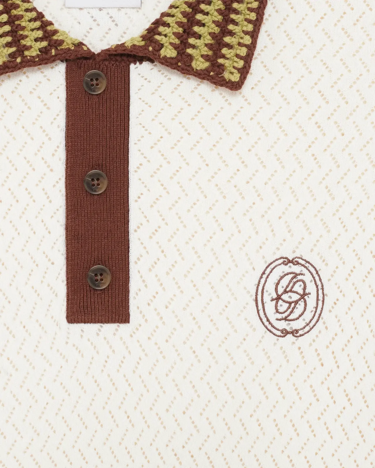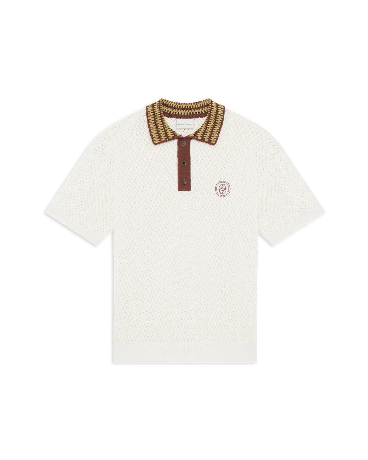 This off-white short-sleeved polo, made from 100% cotton openwork knit, features a crochet collar, a mirrored ‚D‘ embroidery on the chest, and a ‚Drôle‘ label on the back.
