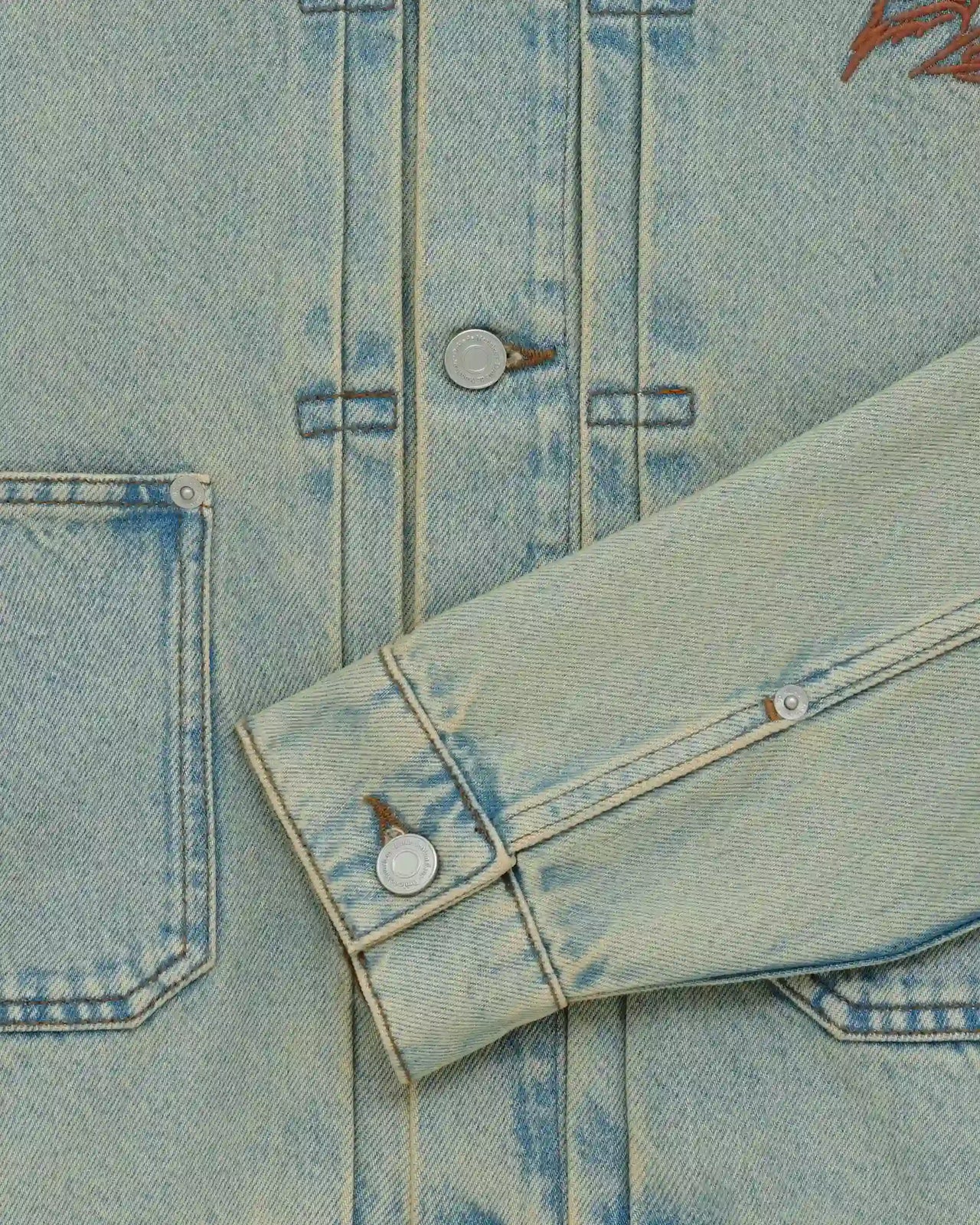 This dusty-effect denim jacket, made from 100% cotton, features floral embroidery and a leather patch on the back. It has six engraved denim buttons on the front, a shirt collar, two raglan pockets, and adjustable waist tabs.