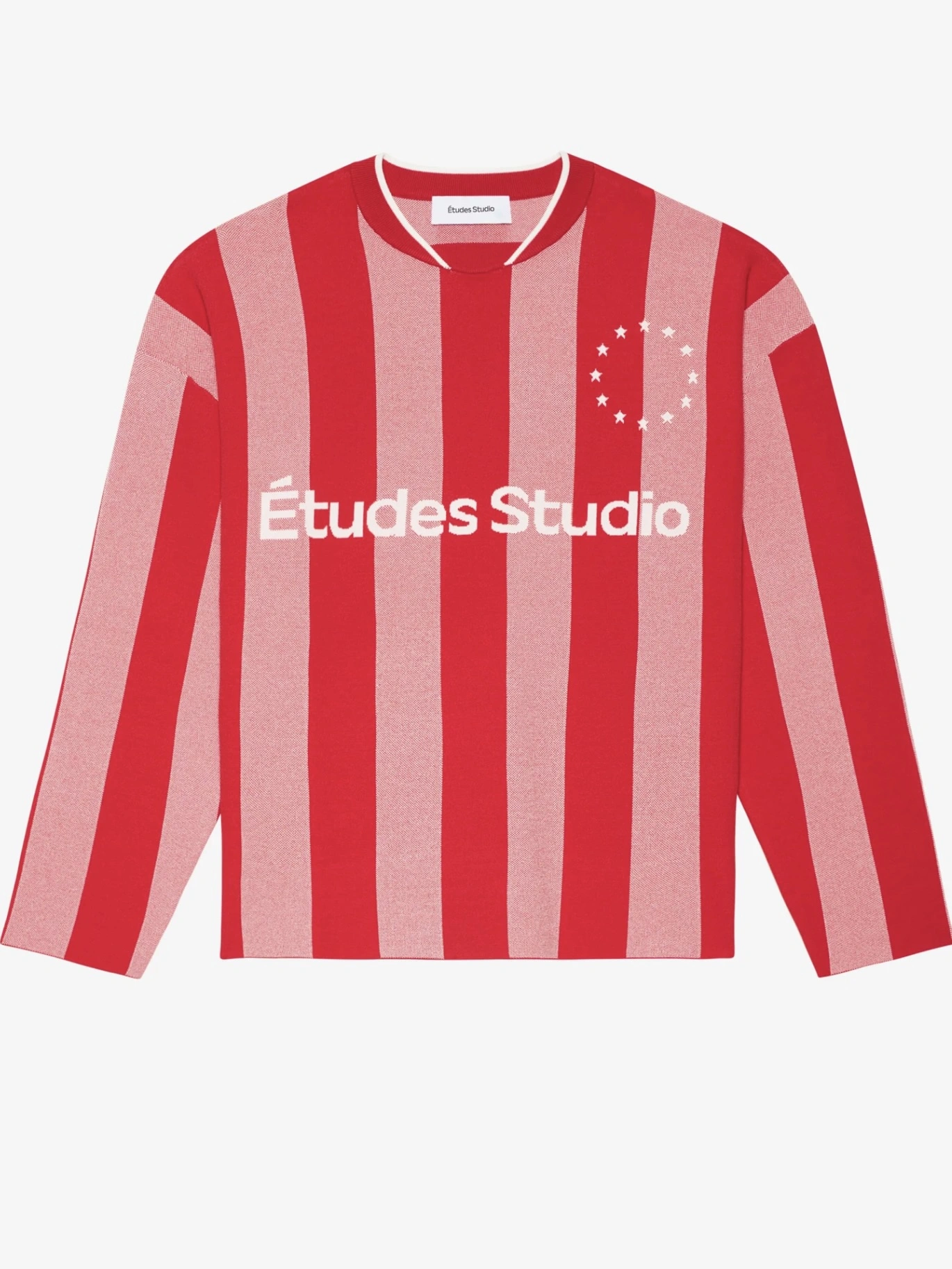 The Soccer Striped is a long sleeve t-shirt inspired by soccer kits. The fit is regular, the collar is a rib knit crewneck. It features allover stripes, the Études Studio logo on the middle and an Europa logo at chest and back.