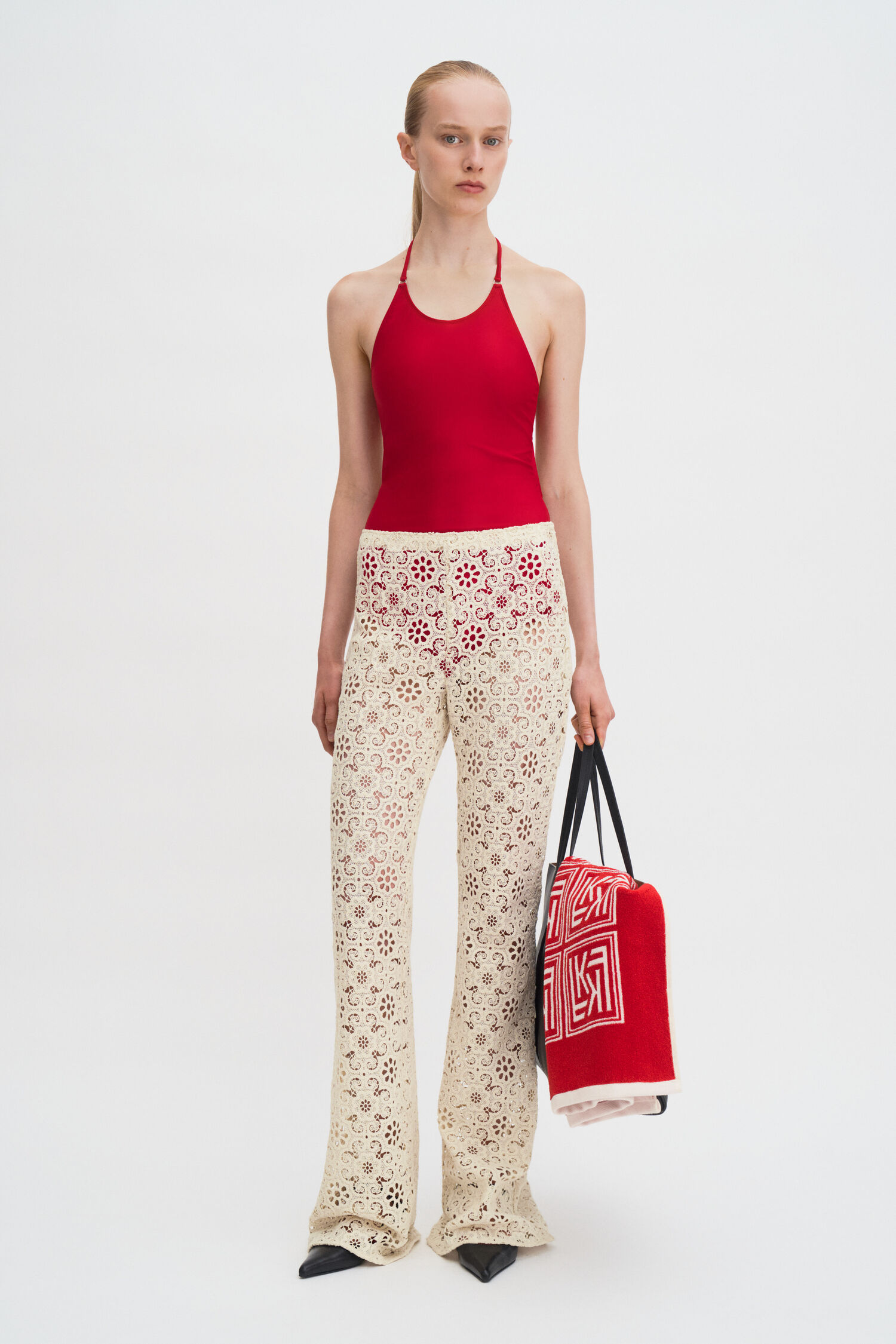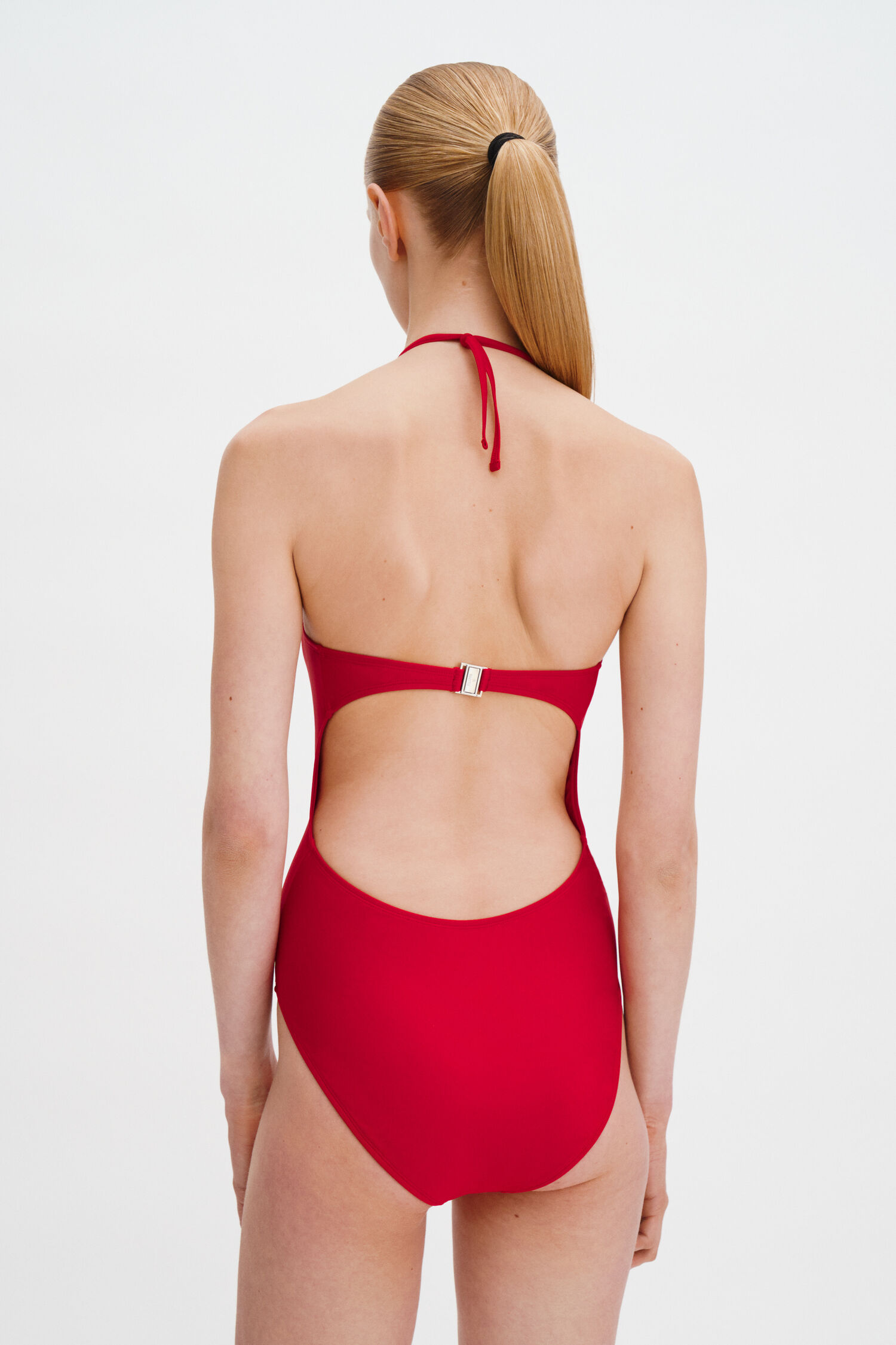 The Strap Swimsuit is made from stretchy, recycled polyester swimwear fabric. It features a metal buckle with logo on the back and a tie strap at the neck.