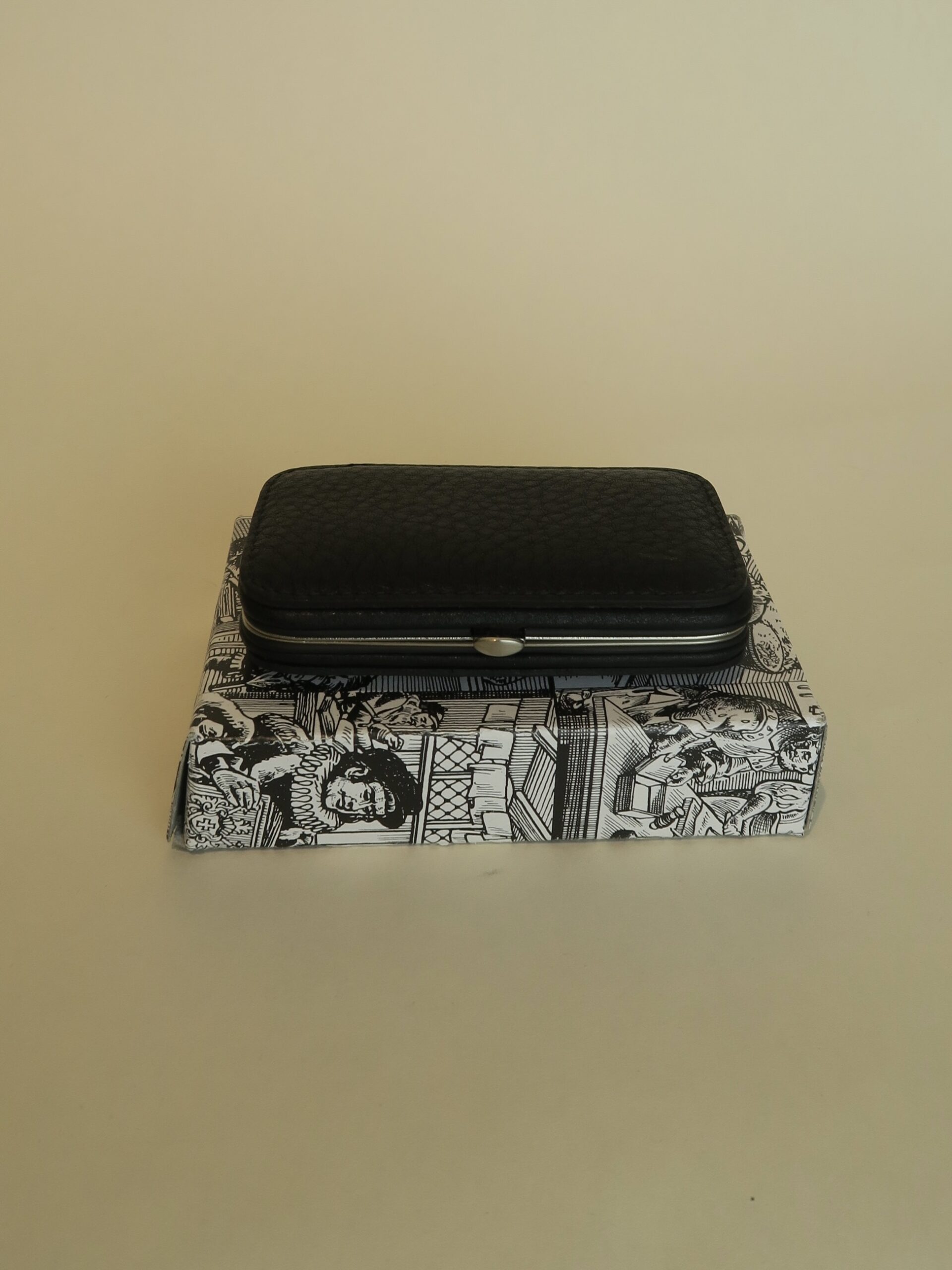 Manicure case made of soft, natural Chervo calf leather, lined with leather. Thanks to the fine, precisely closing metal frame – an absolute F. HAMMANN speciality – the case is slim and very easy to open and close. The case contains high-quality stainless steel tools from Eschenburg: nail scissors, cuticle scissors, tweezers, nail file and cuticle pusher.