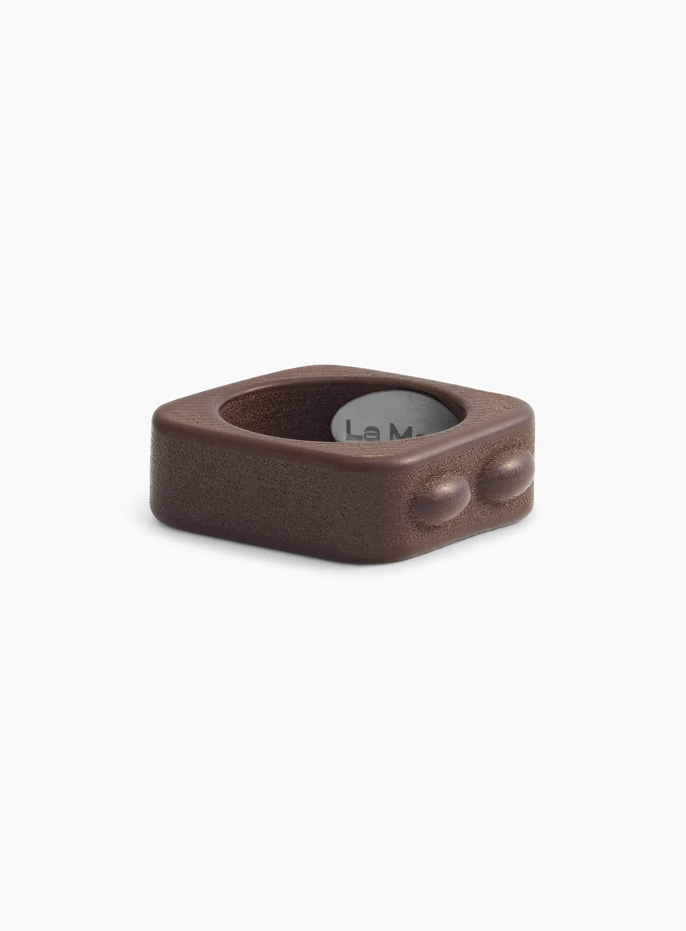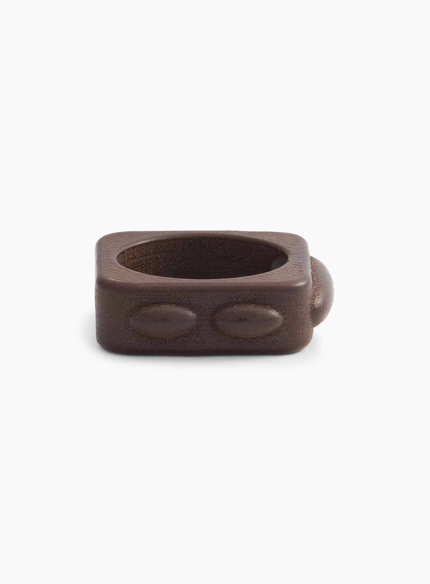 This beige ring is 3D printed and made out of 80% Polylactic acid & 20% cork fibers.