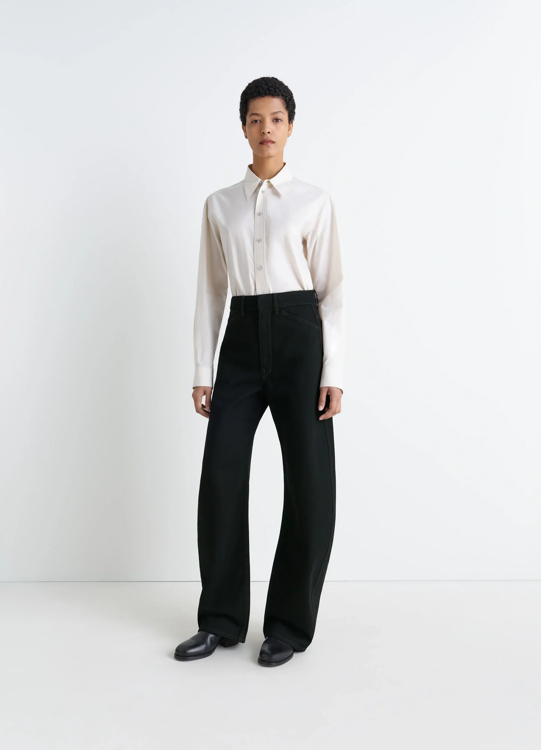 These pants are part of LEMAIRE’s iconic pieces. They are made of a heavy denim with a visible twill weave and a deep black wash. They are high-waisted with a concealed closure, and have long, straight legs with slightly twisted side-seams. They feature classic denim details such as four pockets including a ticket pocket, and contrast stitching.