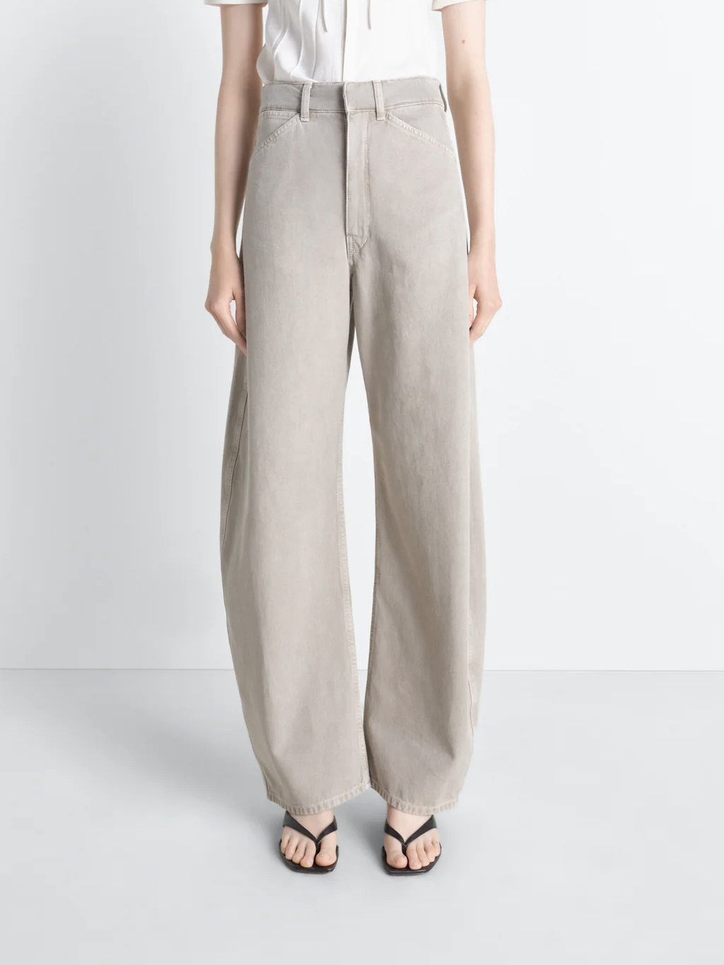 These High Waisted Curved Pants are a classic shape in LEMAIRE’s vestiaire. They are made in garment dyed snow heavy denim, a classic LEMAIRE fabric with a thick, round hand that has been pigment dyed to evoke a snowy surface. They are high-waisted with a concealed closure, and have long, straight legs with slightly twisted side seams. They feature classic denim details such as five pockets and contrast stitching.