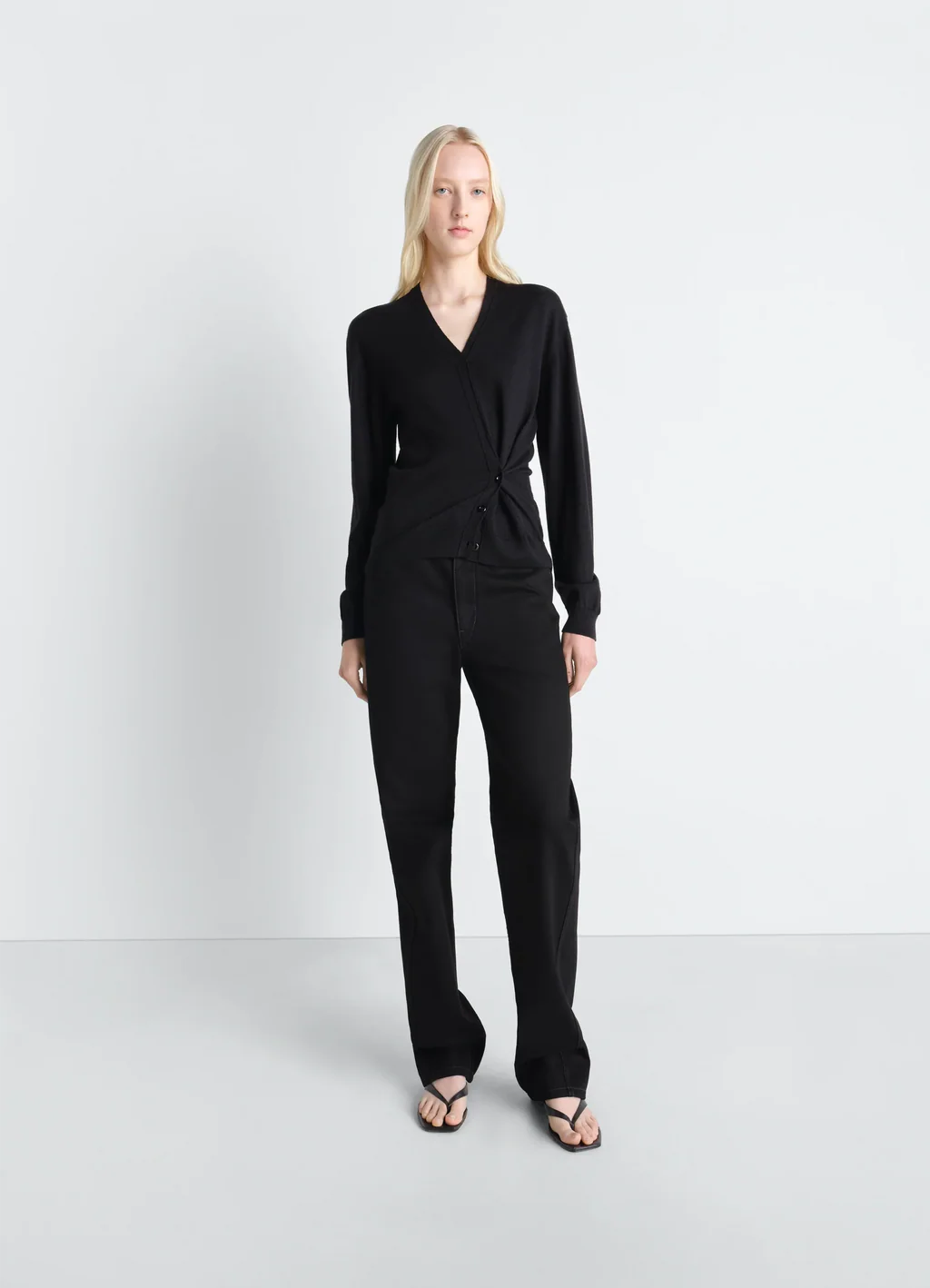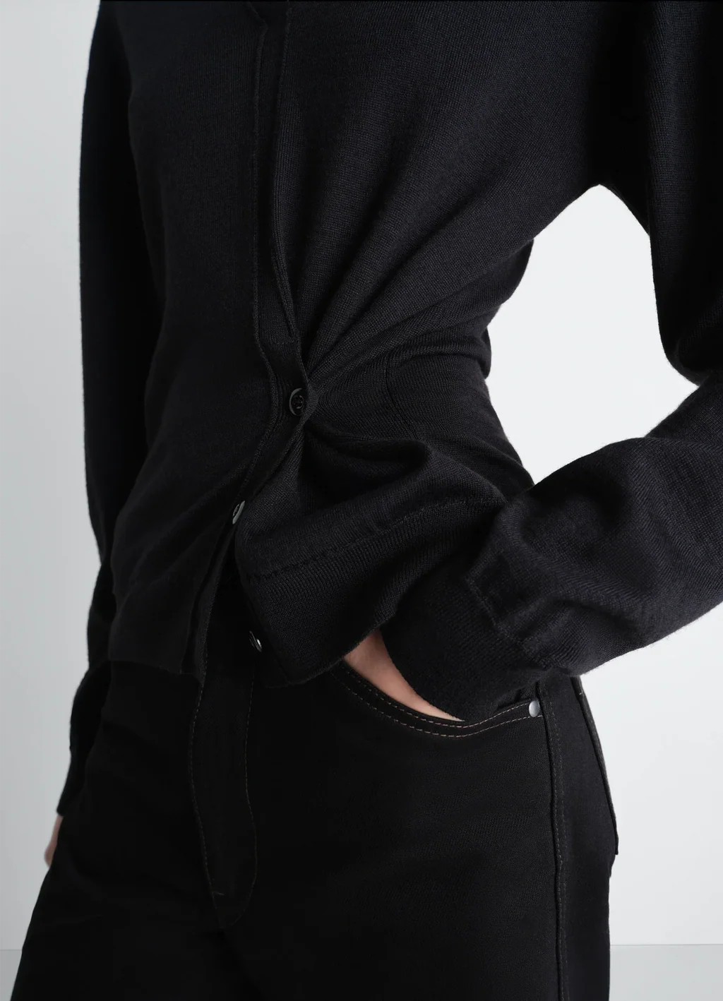 This fine sweater with a twisted construction features a side button placket that can be worn open or closed. It is knitted in a merino-wool blend.