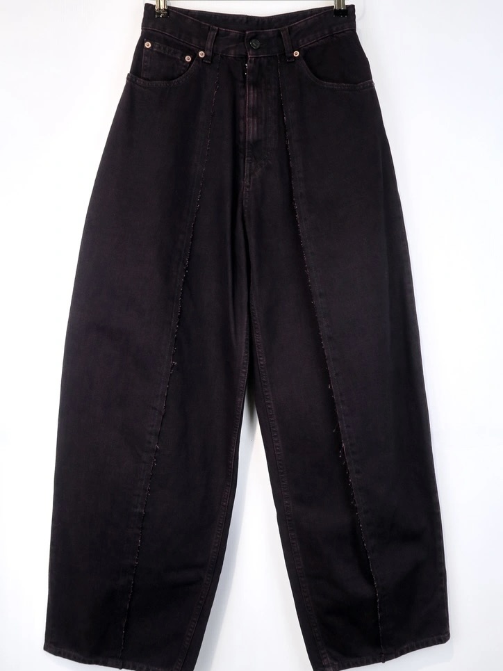 Mid-weight 5-pocket dark purple unisex jeans which feature a contrasting central seam to balance the loose, wide legs.