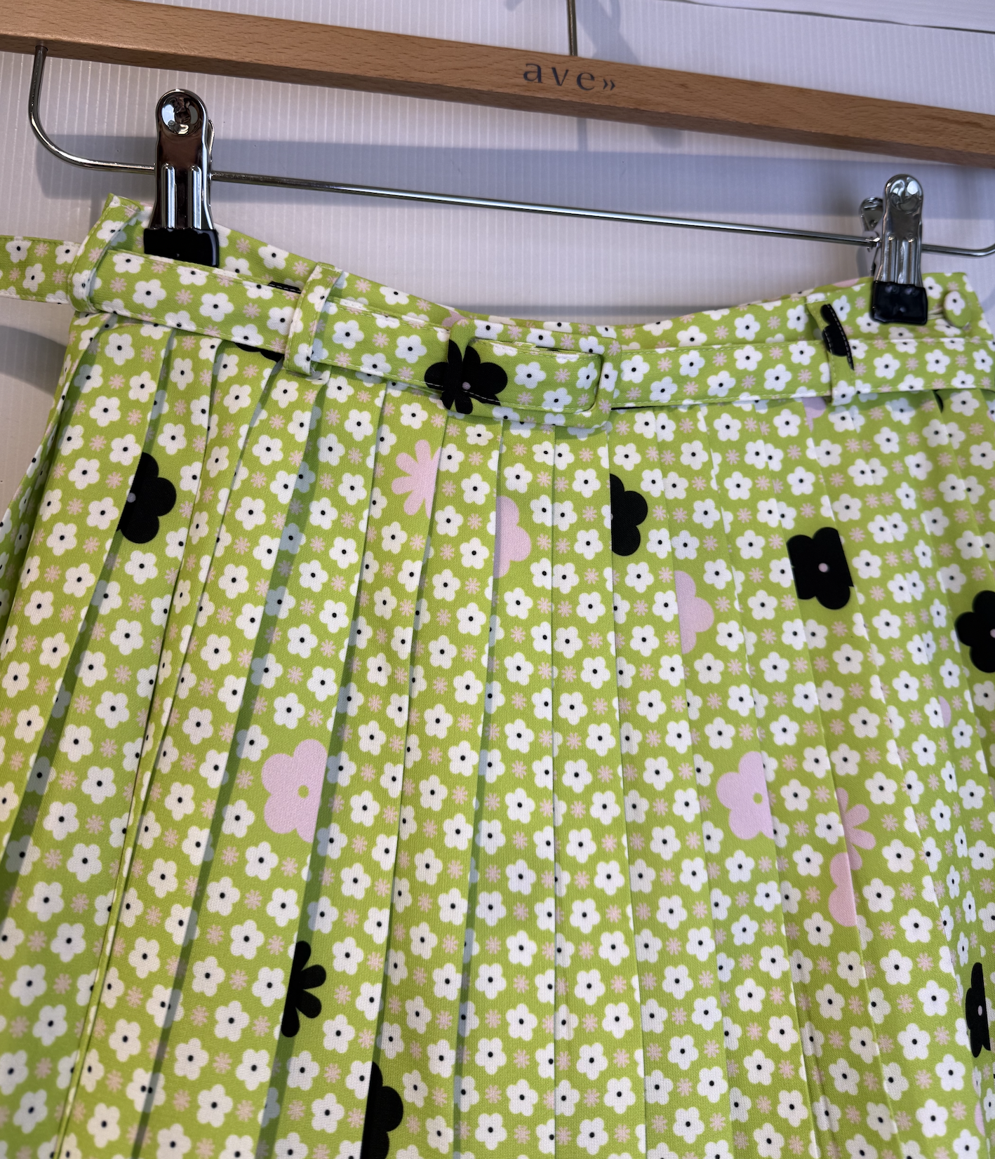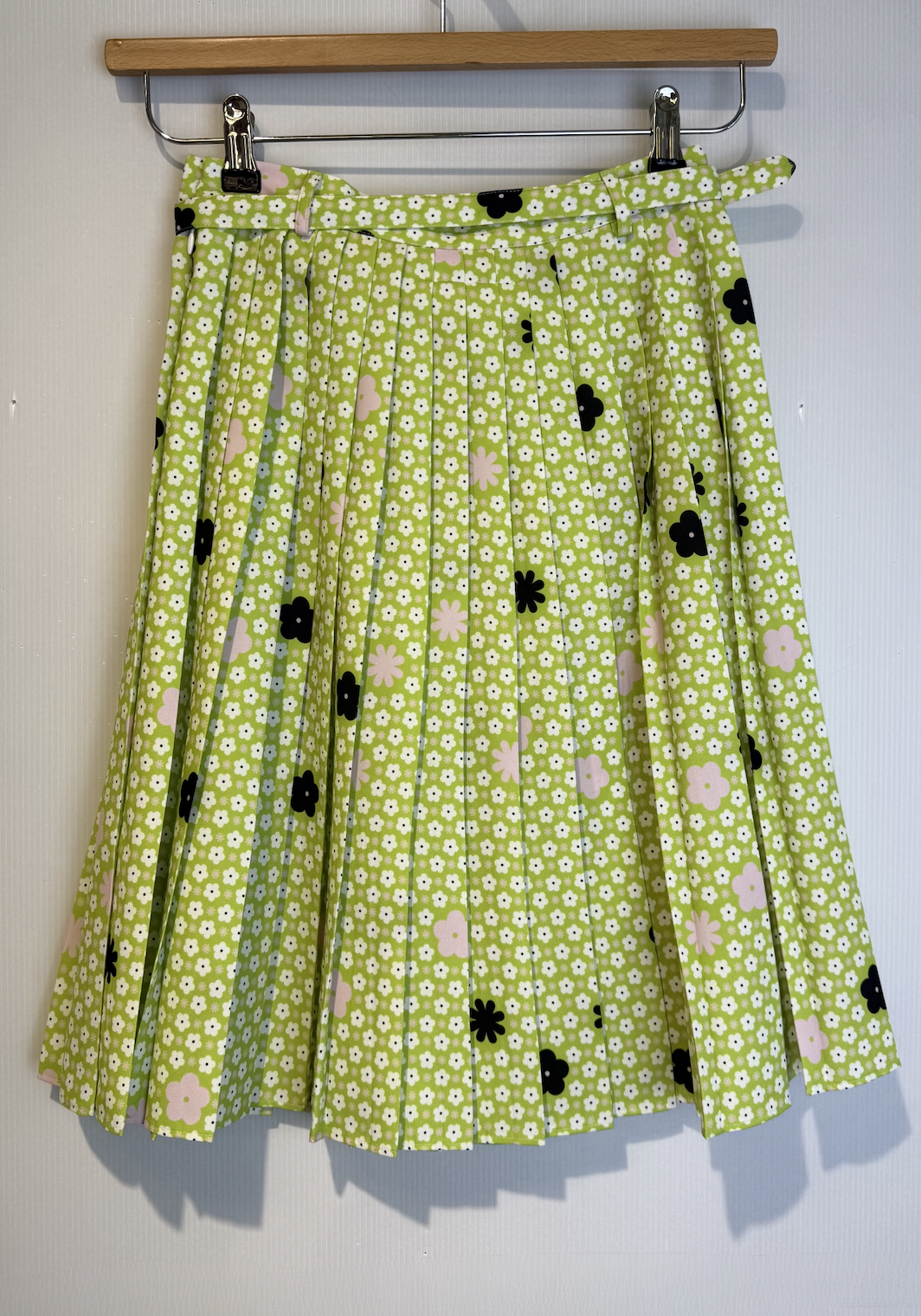 Classic pleats are reimagined in this knee-length skirt from the MM6 collection through a textured wool fabric. Substantial, evenly spaced pleats fall from the high waist and are defined by an integrated belt that accentuates the silhouette. The design, which draws inspiration from the tailoring traditions of the mid-20th century, is marked on the back by the house’s signature white seam.