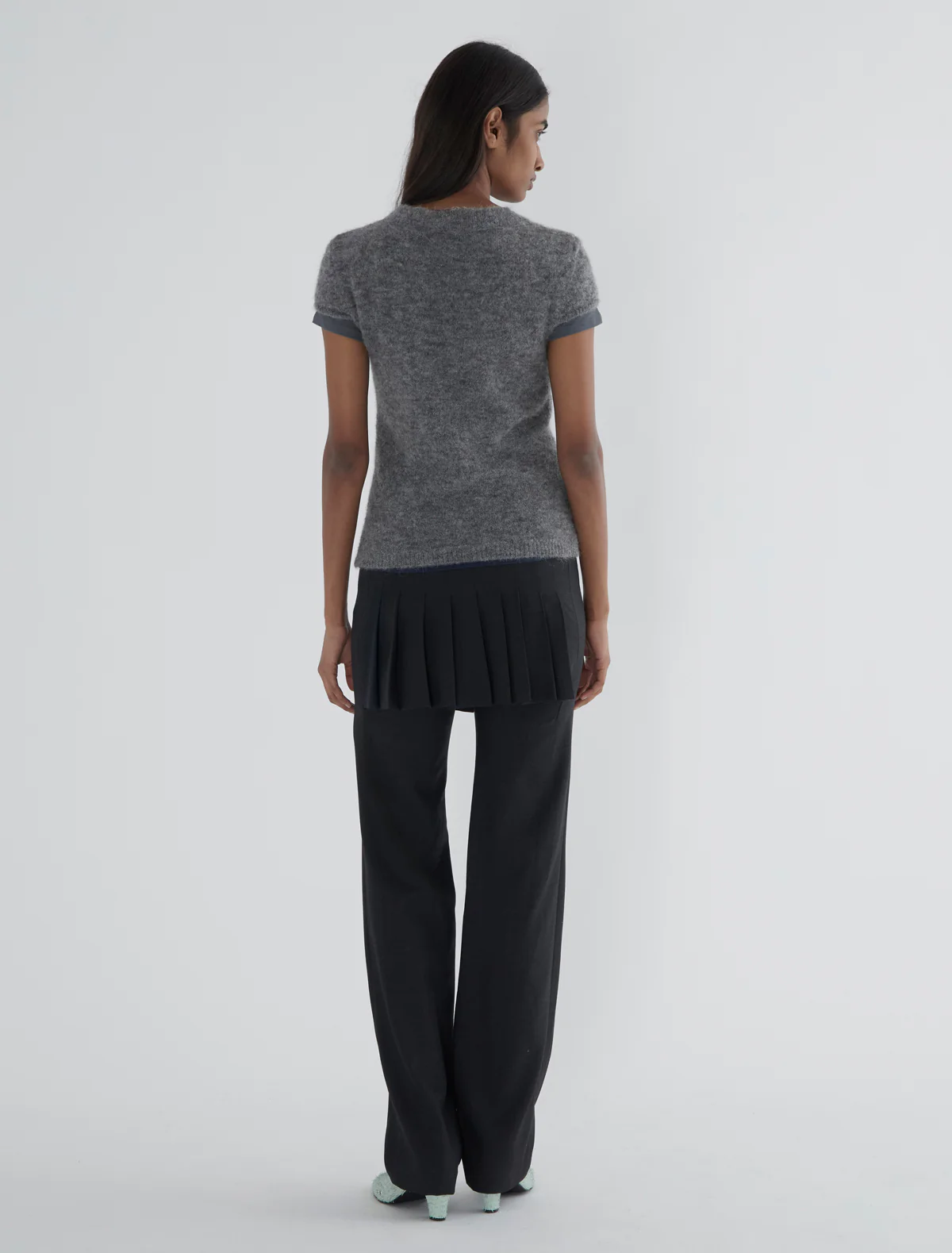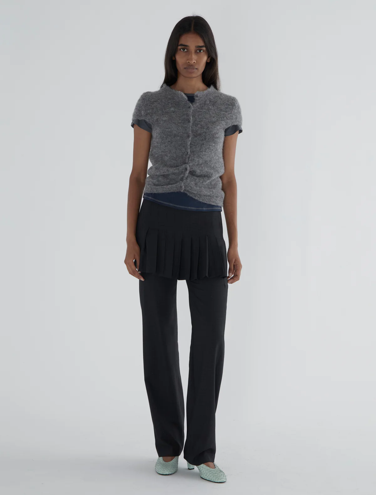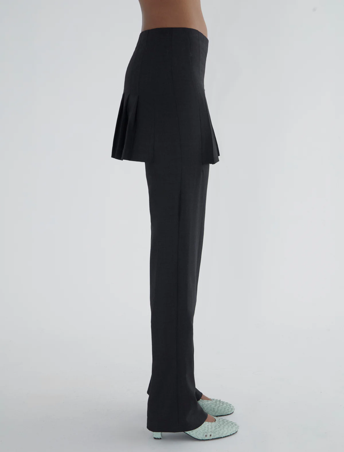 Trousers with a pleated semi-skirt overlay on the front and back, not reaching the sides. Made of suiting fabric with a straight fit.
