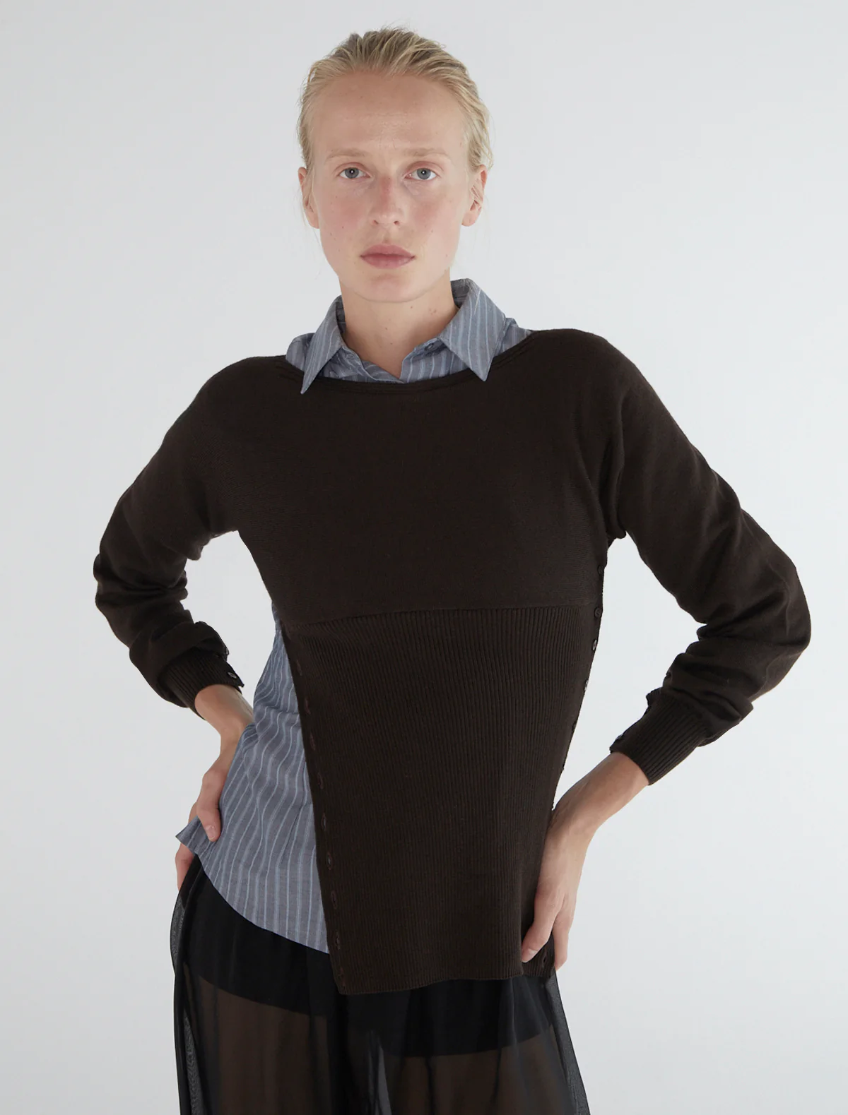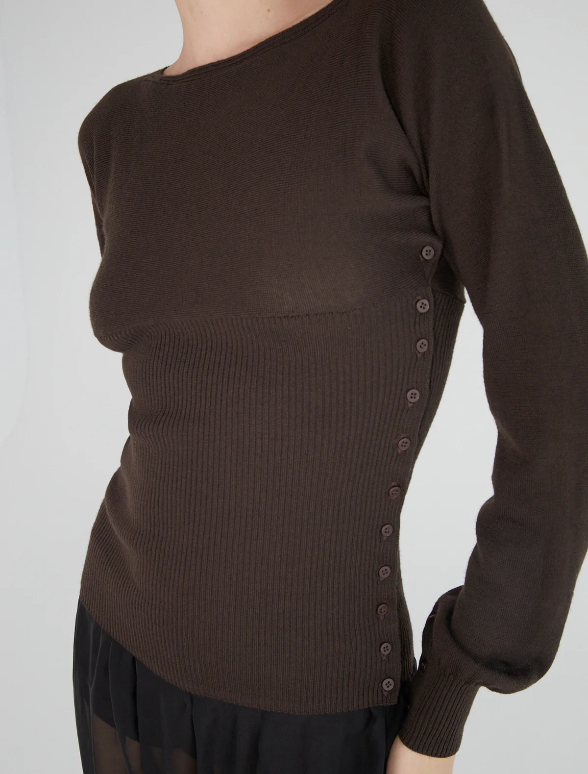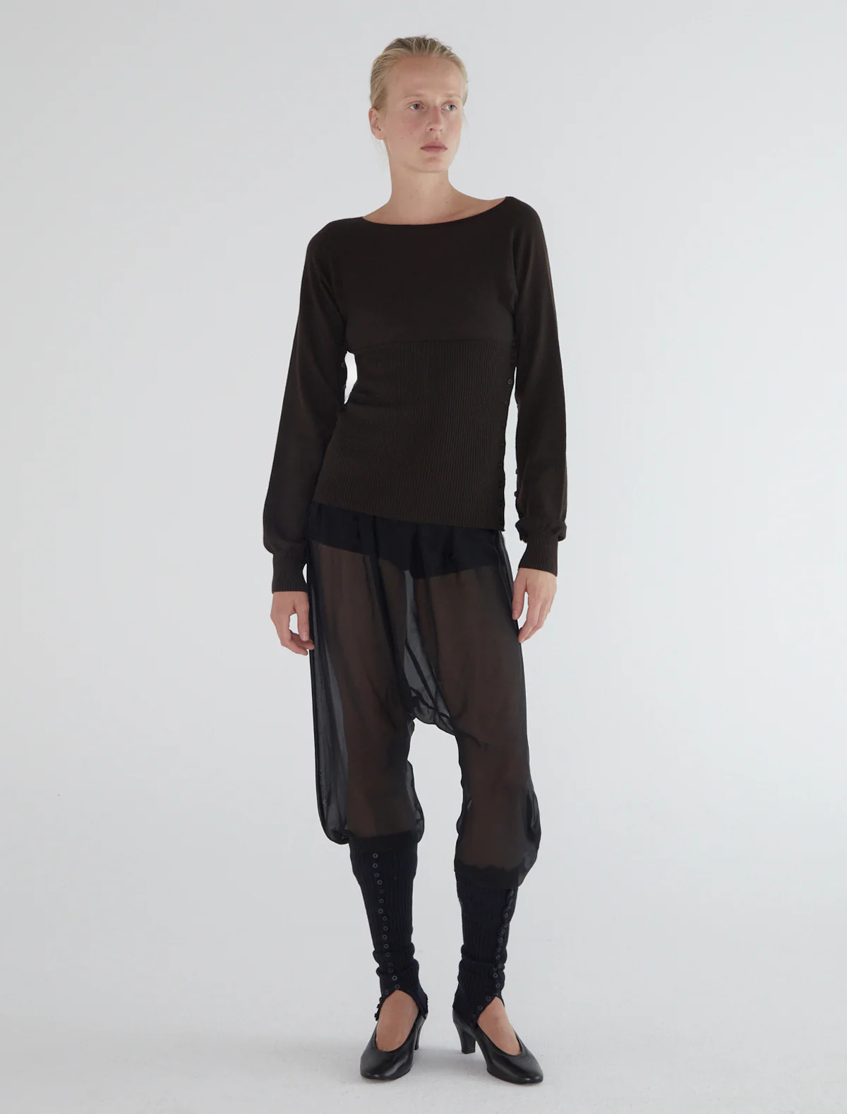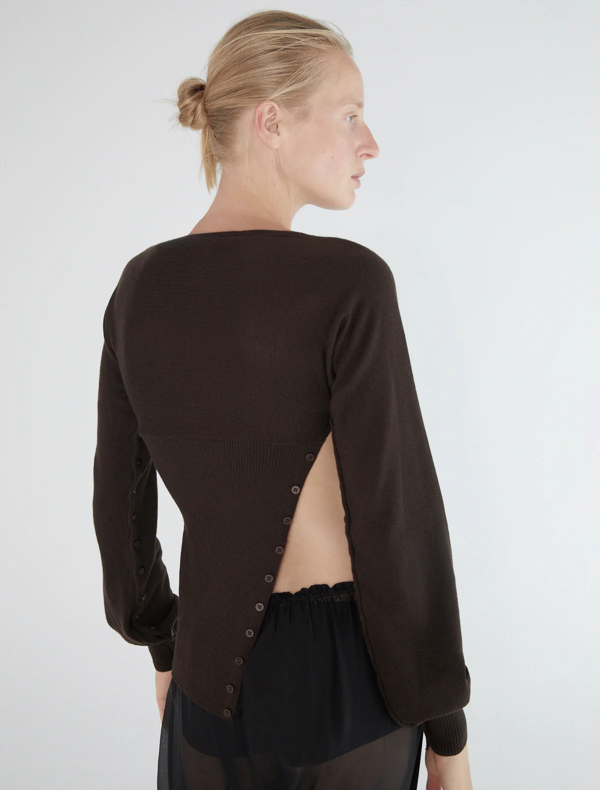 Flat cross-shaped top with buttons along the sides and sleeves for closure. Ribbed body for a close fit, contrasted with looser sleeves. Made of warm, medium-weight wool.