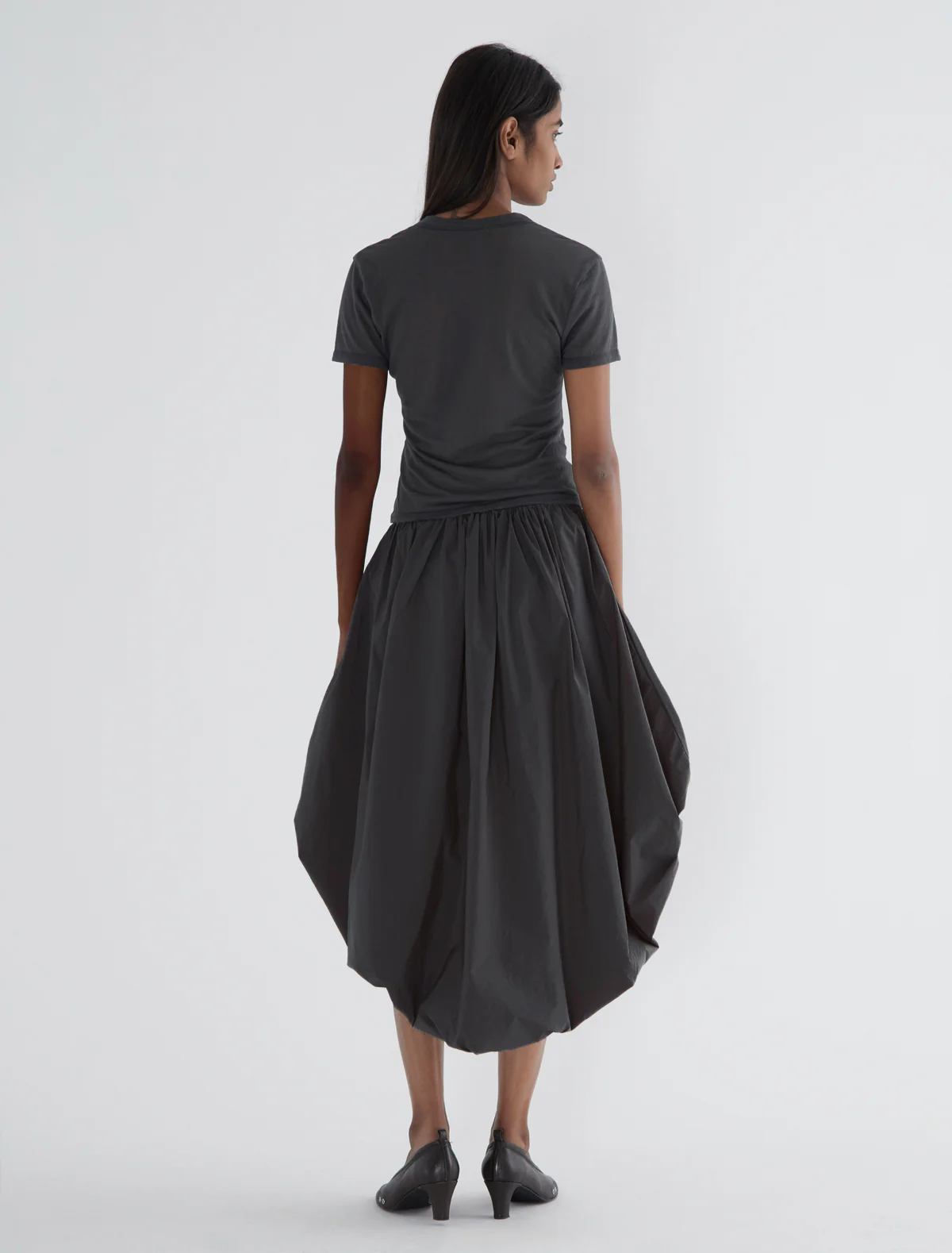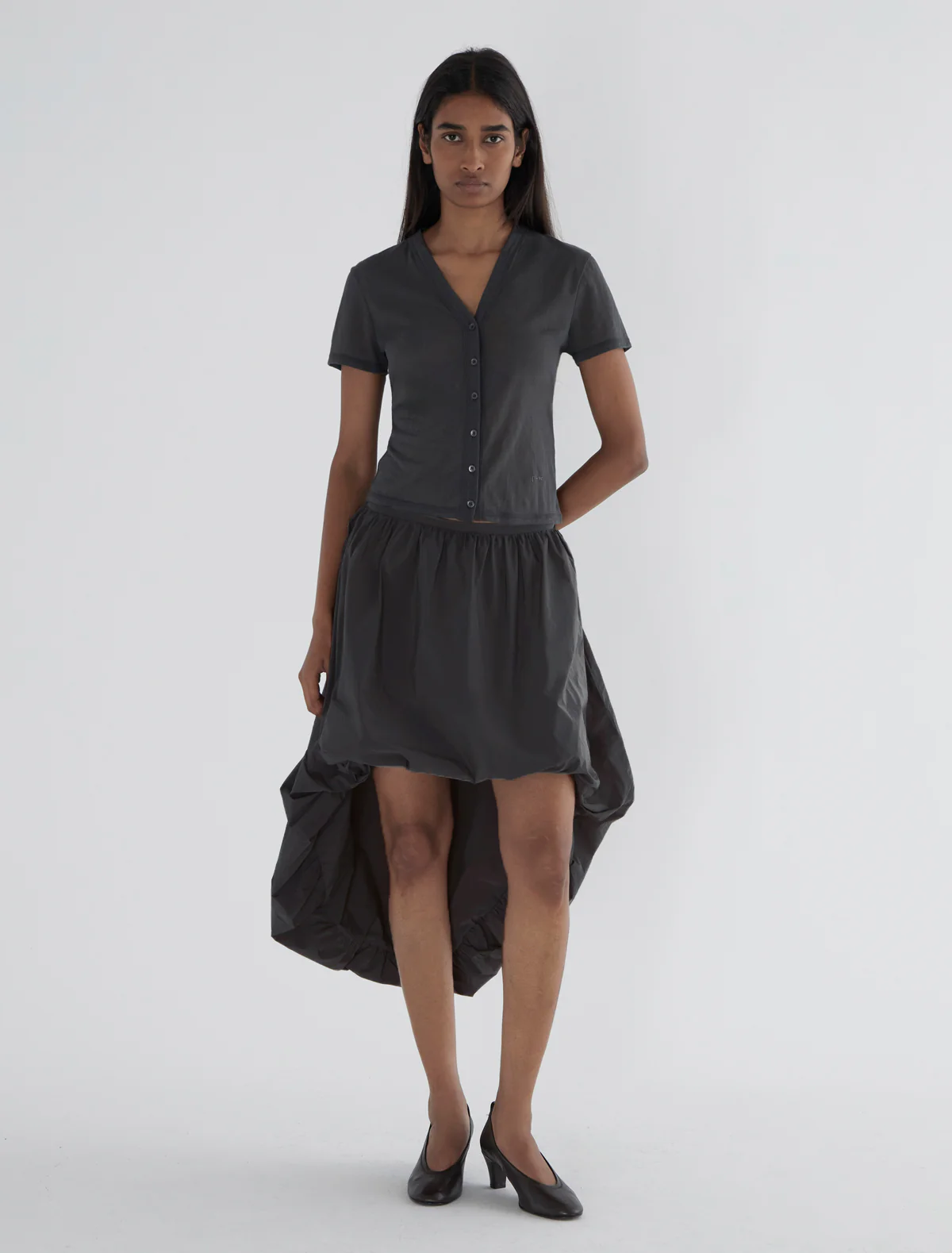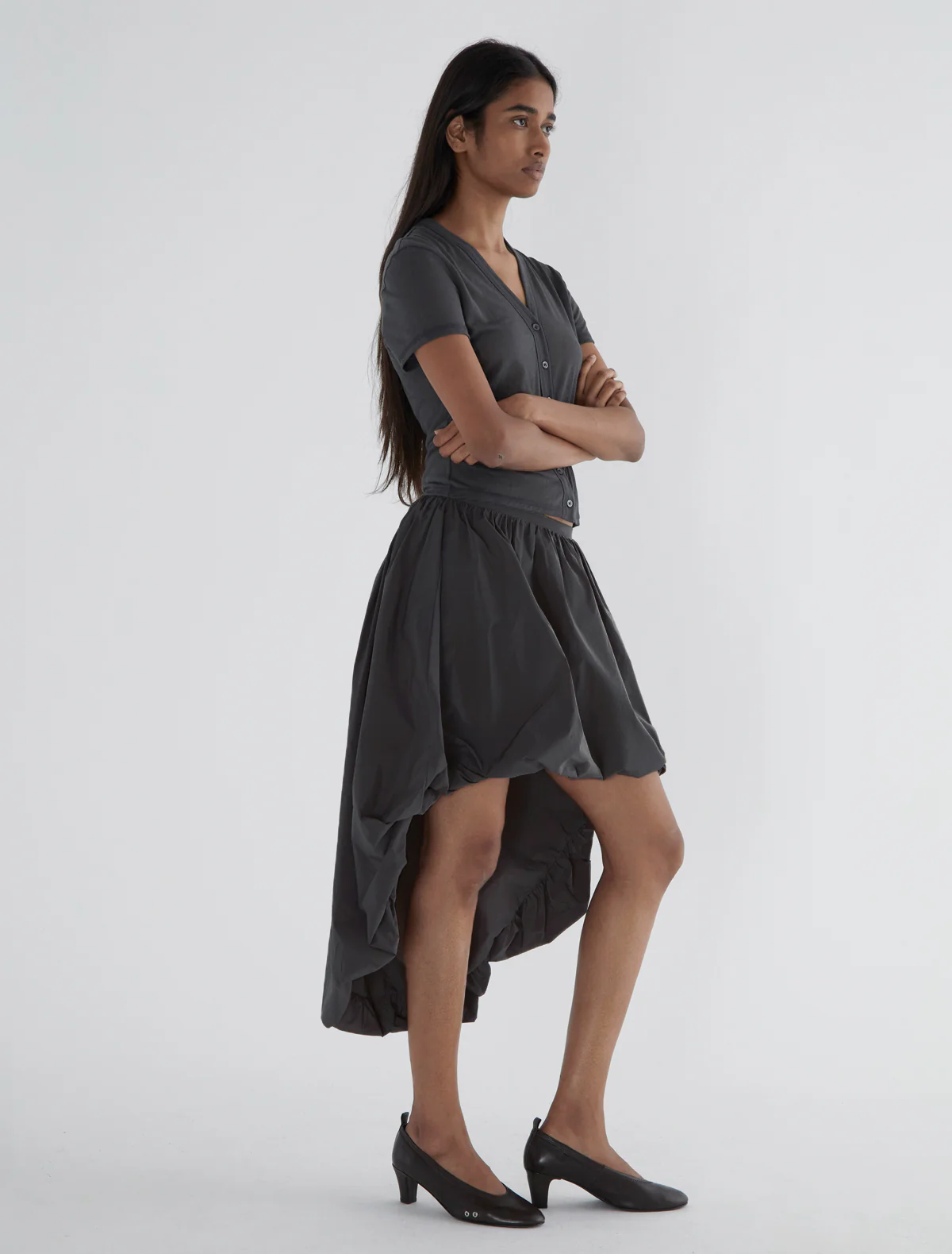 Puffed nylon skirt, longer at the back than at the front. Made of recycled nylon.