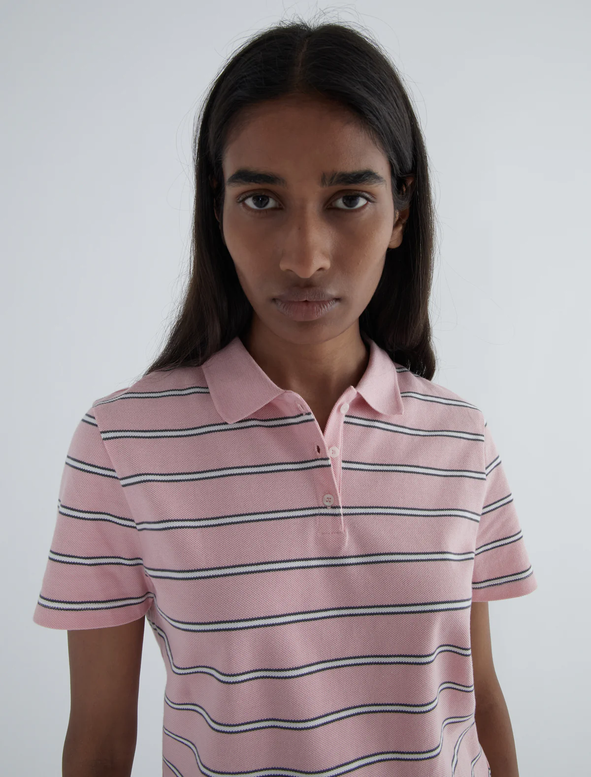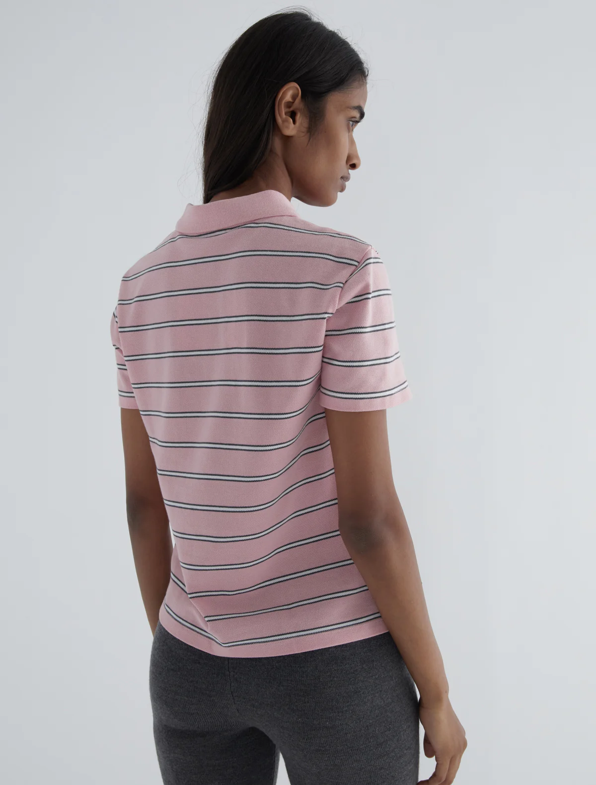 Striped piqué polo with a buttoned placket at the lower front, aligned with the collar placket.