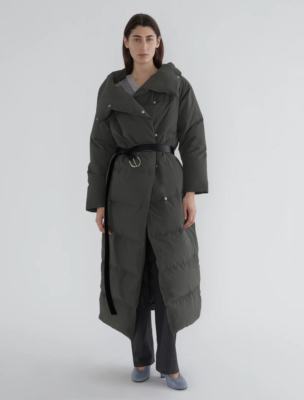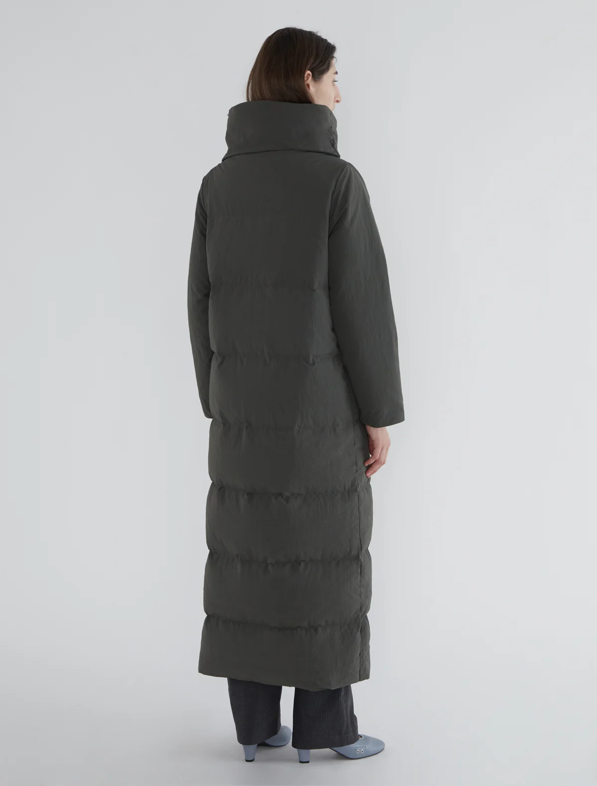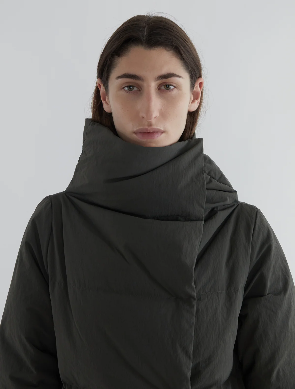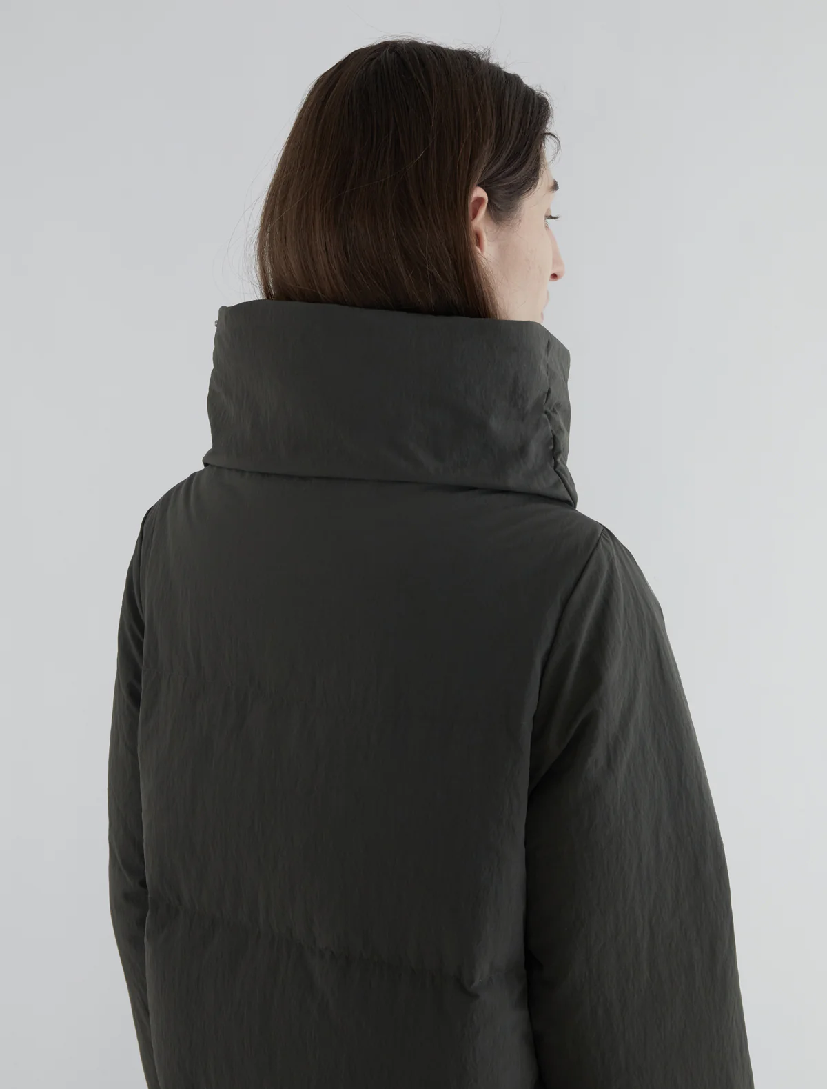 Long puffer coat with an oversized collar and wide crossover front. It features a large inner pocket that allows the coat to be folded and stored inside. Made of slightly stiff nylon fabric.