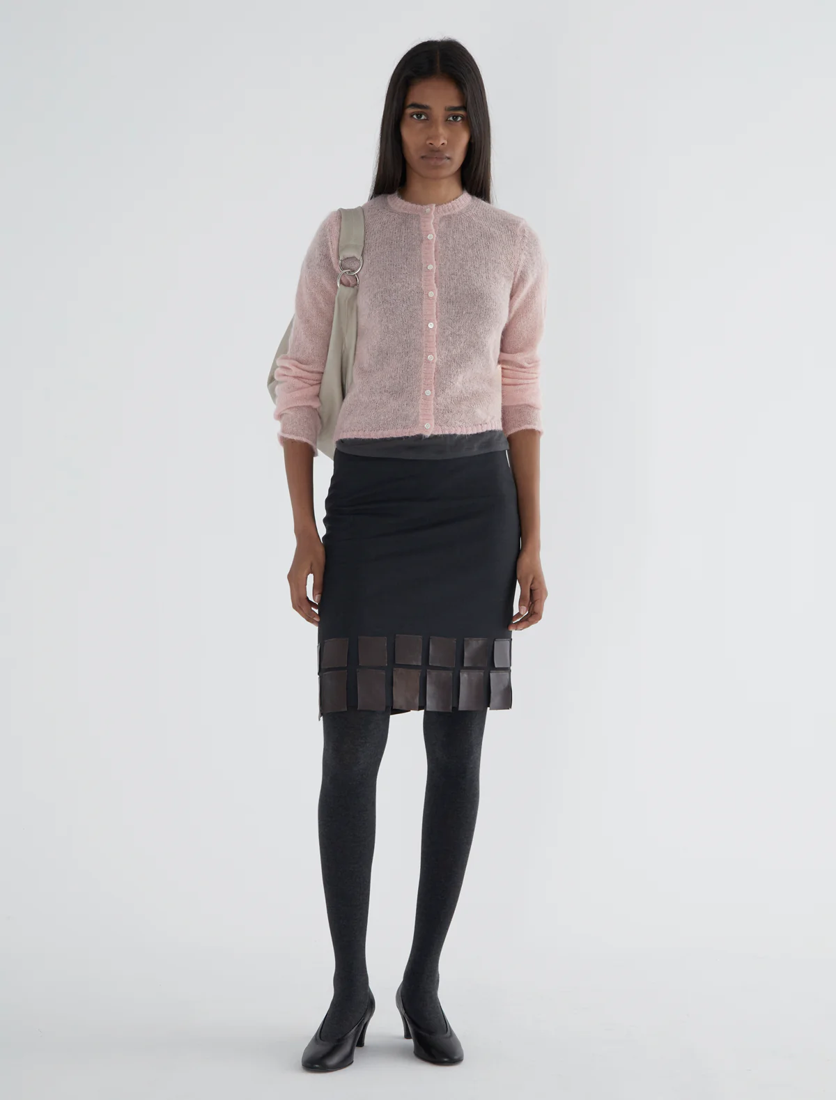 Round neck pink cardigan. Made of warm, slightly hairy, medium-weight knit.