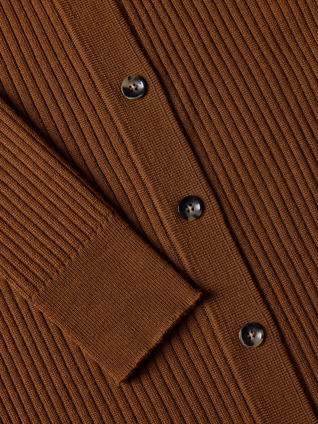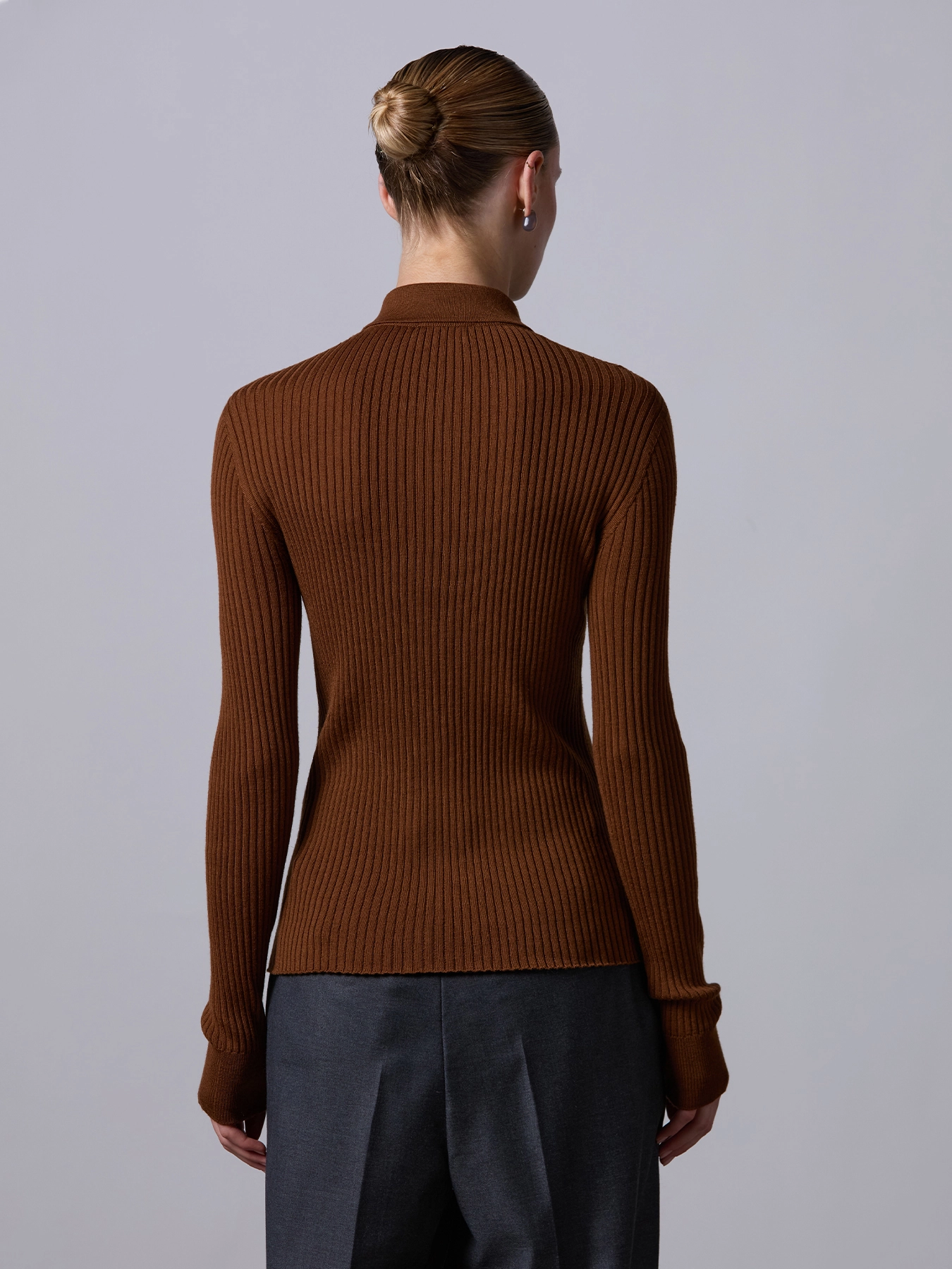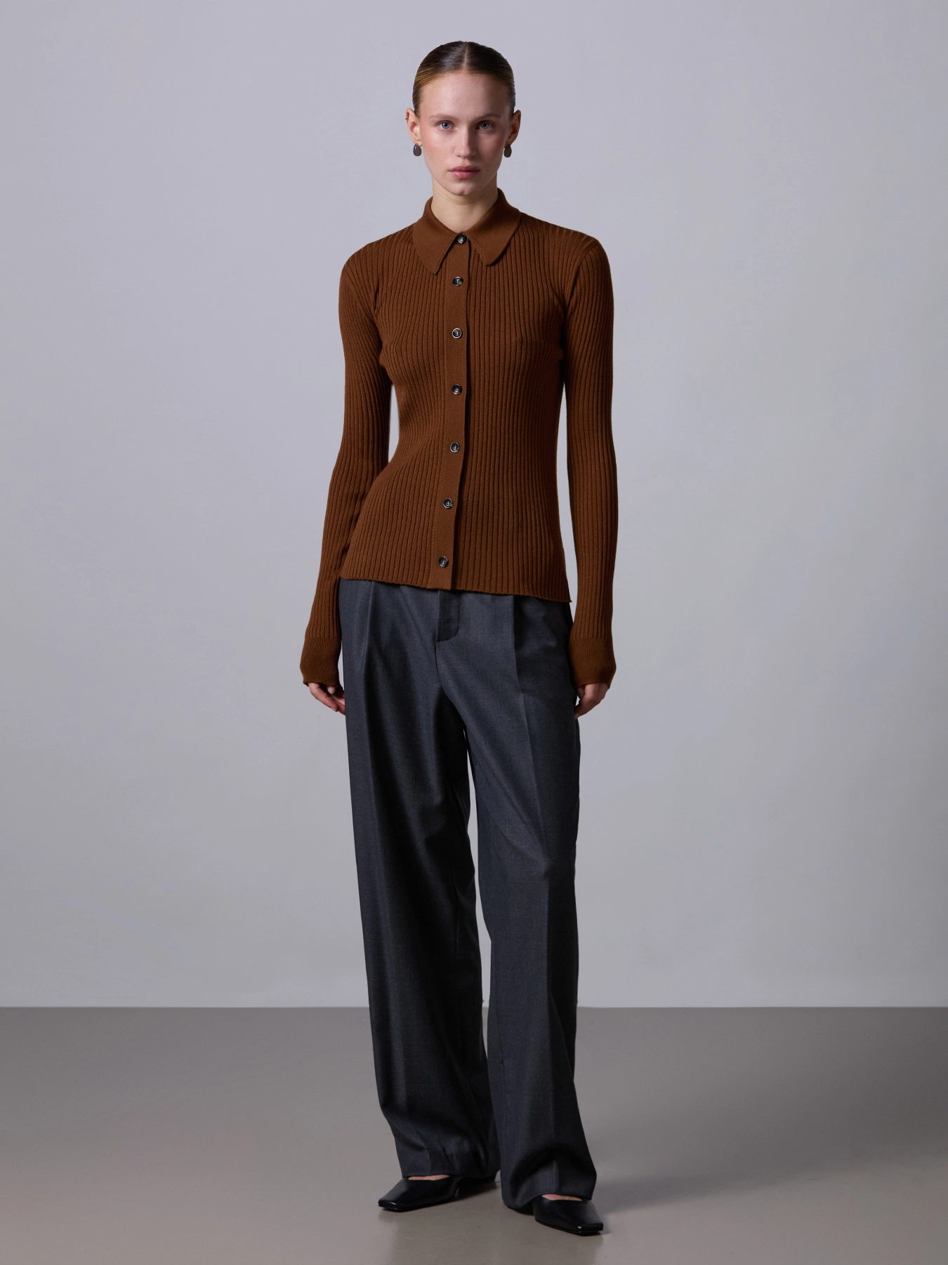 Fitted ribbed shirt made from fine merino wool. It features a button fastening at the front and a knitted shirt collar.
