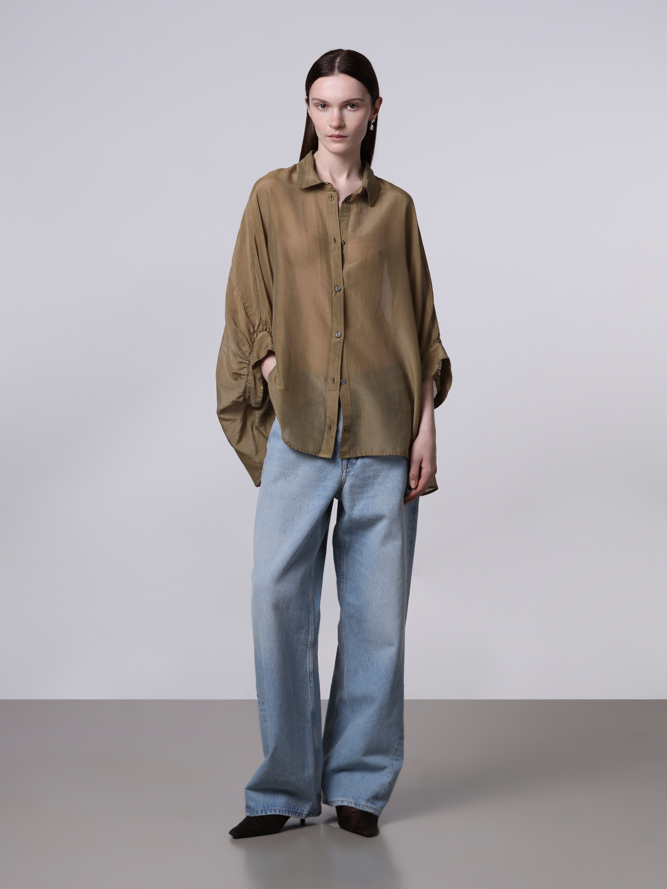 Oversized shirt crafted from a lightweight, semi-sheer cotton-silk blend. Features wide short sleeves, a classic collar, and a button-down front.