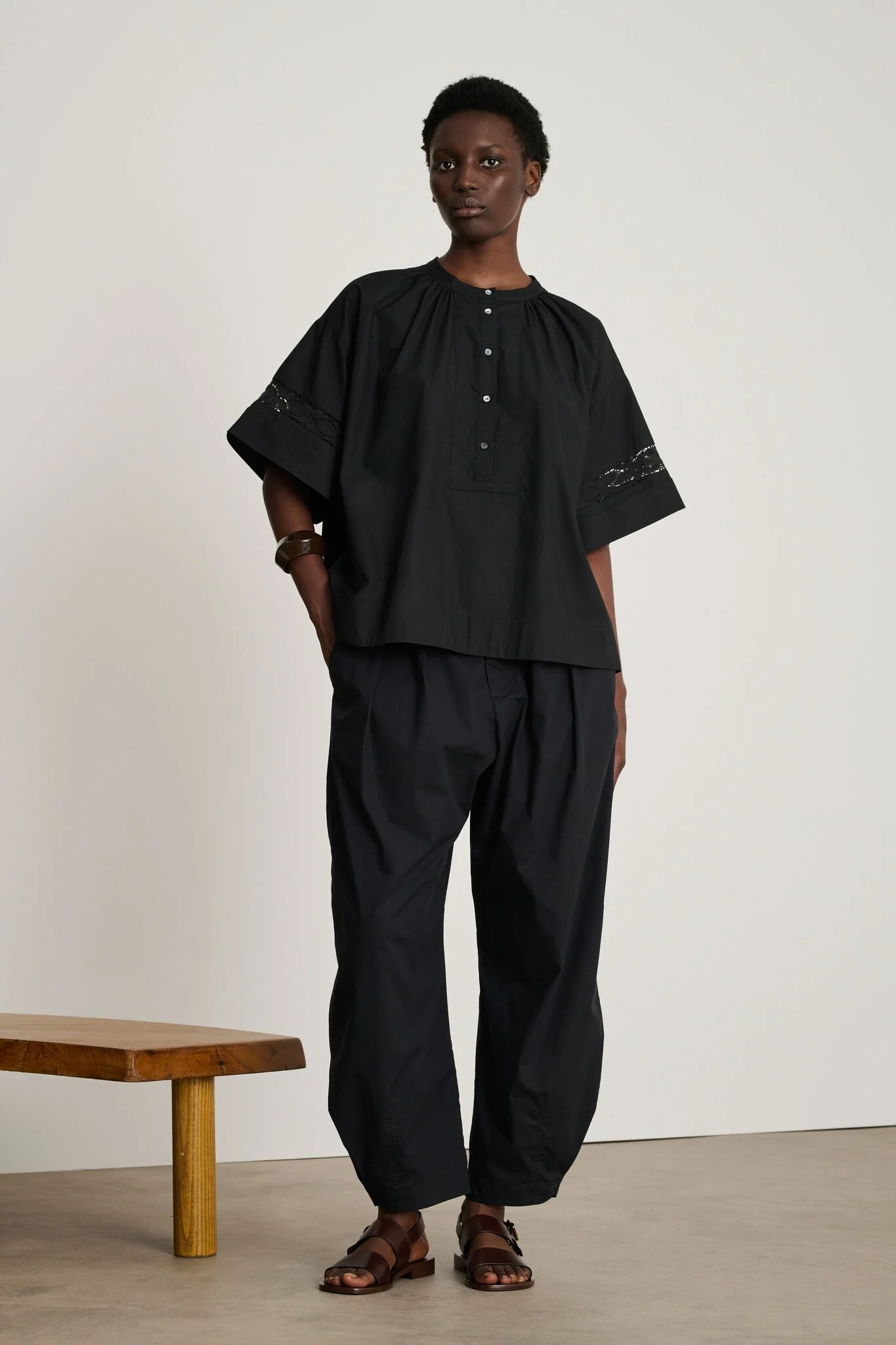 The Albane blouse features a loose fit with pleats at the neckline and delicate openwork details on the sleeves and hem. With a stand-up collar and short, wide sleeves, it is a stylish and comfortable shirt.